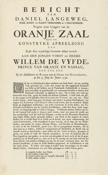 This invitation to bring Prince Willem V to Slot Loevestein was made in 1786 by Pierre Gosse Junior. The layout of the announcement is structured through a hierarchy of font sizes and weights. Observe how the capitalized, bold letters command attention, creating a clear visual division. Semiotically, this division mirrors the social divide the announcement likely aimed to create between supporters and detractors of Prince Willem V. Notice how the capitalized name of Willem De Vyfde sits at the center, drawing the eye immediately and serving as a focal point. This formal choice underscores the announcement's political objective: to rally support and possibly incite action through strategic use of typography. This typography challenges fixed meanings of loyalty by using bold fonts as a call to action.
