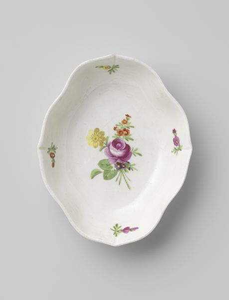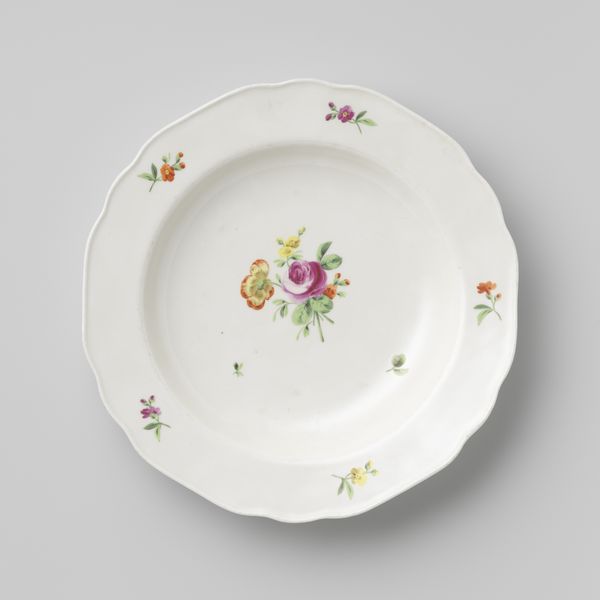 Editor: We're looking at a porcelain plate, probably dating somewhere between 1800 and 1849, made by the Kaiserliche Porzellanmanufaktur. It’s decorated with hand-painted floral sprays – so delicate! It gives me a wistful, springtime feeling, almost like something out of a Jane Austen novel. What do you see in this piece, beyond just a pretty plate? Curator: Well, isn't it lovely? The plate is more than just decorative; it's a glimpse into a specific cultural moment. I can almost smell the tea and hear the polite chatter of a formal gathering. How do you imagine this piece was used in its time? Editor: I'm picturing ladies in bonnets nibbling cucumber sandwiches. Maybe it was for special occasions, or perhaps everyday luxury for a wealthy family? Curator: Precisely! The quality of the porcelain and the detailed painting suggests a level of affluence. It reflects an era where artistry and everyday life were intertwined, and something as simple as a plate was elevated to an art form. Imagine the skill of the painter. What details catch your eye the most? Editor: Definitely the central bouquet; that single rose, fading from yellow into the deepest red, is just stunning. I can see how much detail and artistry went into its creation! I mean, it’s so beautifully observed. Curator: Yes, and each little spray around the edge seems deliberately placed. They knew how to capture light, emotion, even meaning within a flower. It speaks to the idea that beauty wasn’t just seen; it was cultivated. What feelings do these details evoke? Editor: A sense of preciousness, definitely. Knowing how fragile porcelain is, there’s also this bittersweet understanding that beauty is fleeting. Like a real rose, its time is limited. Curator: Beautifully put! I see in it the endless cycle of nature reflected in human artistry. It makes me ponder what ordinary objects will say about our lives centuries from now.