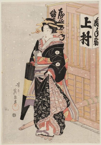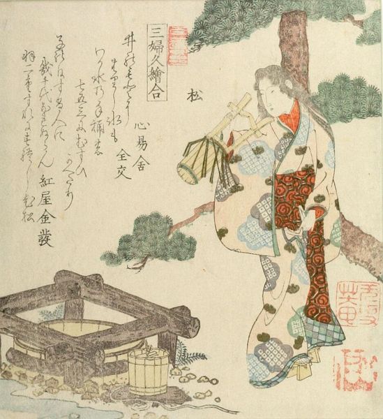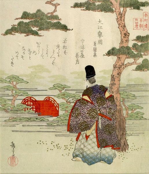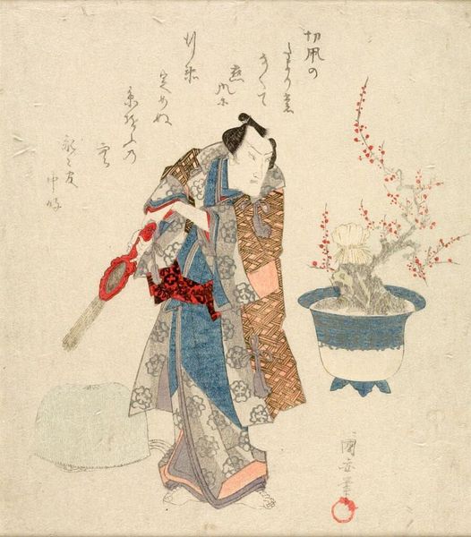 Editor: This is "Warrior Enjoying Plum Tree" by Yashima Gakutei. It’s a woodblock print depicting a warrior standing by a tree with what seems like a sunset behind it. What does this image say about the role of the warrior in that period? Curator: Well, we see the warrior depicted in a moment of leisure, contemplating nature, which links back to the established tradition of scholar-officials in East Asia. The plum blossom also has cultural meaning, representing resilience, renewal, and nobility. How might such imagery affect public perception of warriors? Editor: I hadn’t thought about the symbolism of the plum blossom. It’s interesting how art can shape views about socio-political figures. Curator: Exactly! The power of imagery in shaping public perception cannot be overstated. It makes you wonder about the intended audience and the message Gakutei aimed to convey.