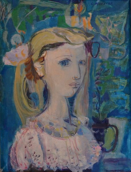 Editor: Here we have "Jeunes fille aux fleurs," an oil painting attributed to Jean Dupas, though its exact date is unknown. The woman's gaze and the overall softness of the image give off a sense of serene self-assurance. What can you tell me about this work? Curator: What I see is a captivating study in the construction of femininity during the Art Deco period. Consider the stylized features of the young woman, a deliberate departure from the realistic portrayals of the late 19th century. Notice how her simplified, almost mask-like face draws from earlier classical artistic tropes to construct an idealized image of women as almost otherworldly creatures, even objects of desire. Editor: Objects? So, is this about female representation in the early 20th century? Curator: Precisely. Look at the way the flowers are arranged in her hair, functioning almost as adornments that highlight her beauty, but also subtly objectify her, placing her in a tradition that confines women to their appearance, particularly in commercial art. Editor: So, even though it appears gentle, this piece actually engages with some deeper commentary? Curator: I believe so. Dupas' work encourages us to think critically about the historical contexts in which notions of femininity were formed. The painting invites conversations about power, gender, and the role of art in either challenging or reinforcing societal norms. This can be a departure point to understand identity from a political perspective. Editor: It's amazing how much the cultural context adds to how we understand the work. Curator: Absolutely. This portrait invites viewers to question assumptions about beauty and representation. This reflection should make us more informed, or at the very least aware of the history behind some aesthetic criteria that continue to this day.