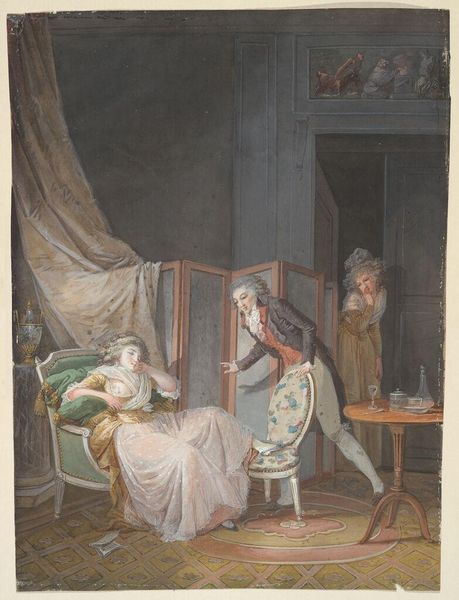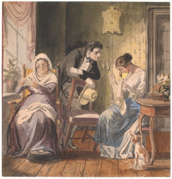 Editor: Here we have John Callcott Horsley's, *The Pride of the Village* from the Tate Collection. It depicts an interior scene, and the texture of the fabrics is quite striking. What can you tell me about the materiality of this piece? Curator: Well, consider the wool and linen in the clothing, likely homespun. The production of these textiles would have been a significant labor investment, a central aspect of village life. How does the artist use these details to convey social status? Editor: I see, so the quality and source of these materials would reflect the family's position within their community? Curator: Precisely. It’s a snapshot of Victorian social fabric, woven from the very threads of their existence. It gives the viewer a tangible glimpse into their daily lives. Editor: That's fascinating; I hadn't considered how much the materials themselves could tell the story. Curator: It is an important consideration. Looking closer, we begin to see the subtle ways that the artist communicates their society.