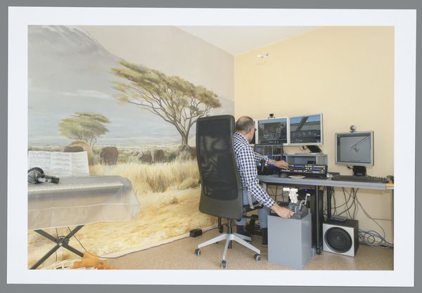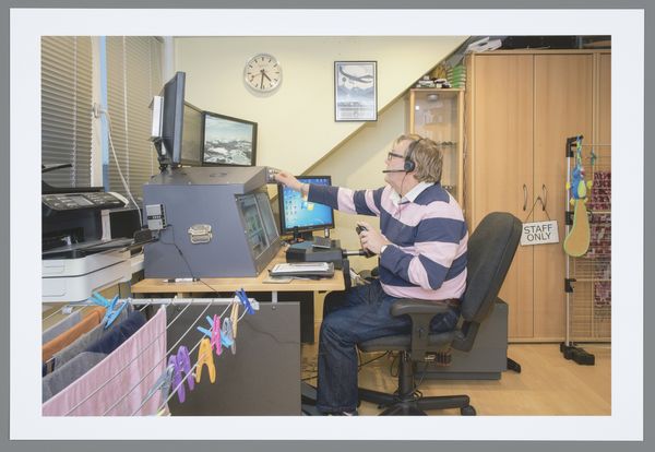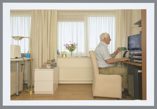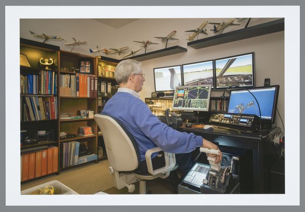 This is Gerrit Meerman's photograph ‘Jurjan (53)’. The composition immediately draws you into a structured, yet somewhat chaotic space. The subject sits centrally, framed by the geometry of the room—a visual anchor amid the surrounding clutter. Notice how Meerman uses light and shadow to emphasize the contrast between the traditional elements, like the wooden desk and antique ornaments, and the modern tech. This contrast could suggest the tensions between history and modernity, or perhaps between the tangible and the virtual worlds. Semiotically, the desk represents nostalgia and tangible labour, whereas the screens evoke the detachment of digital existence. The photograph invites contemplation on how we negotiate these realms. Jurjan is immersed in what appears to be a flight simulator game. What does it mean when our leisure activities start resembling work? How does simulation redefine our understanding of reality and experience? The framing of this image acts as a discourse that destabilizes the division between work and play, reality and simulation. Jurjan's world prompts us to rethink fixed categories, sparking an ongoing dialogue about the blurring lines of modern life.