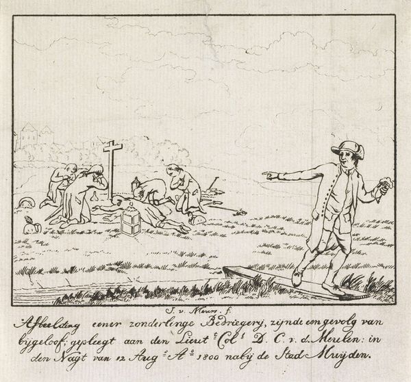 Visscher acquired the plates for 35 landscape prints from the estate of Jan van de Velde II in 1641. For the intended publication he designed a title page, in which he incorporated his trademark: a fisherman presents a sketchbook with landscapes that Van de Velde had dawn from life (in situ) – a rare occurrence at the time. Another depiction was ultimately used as the title page.