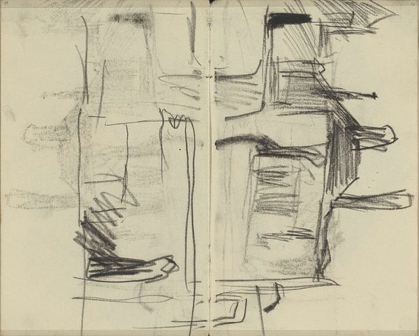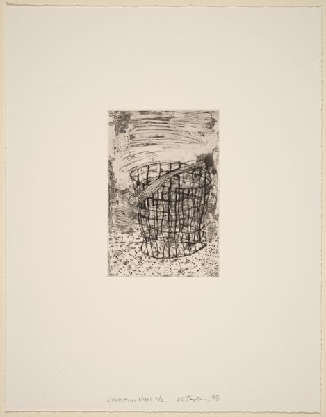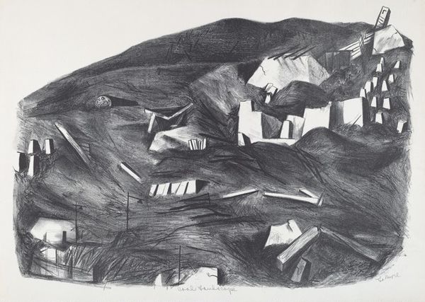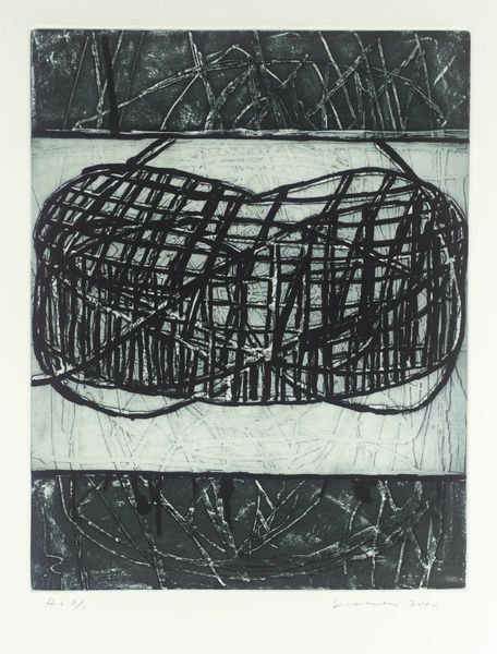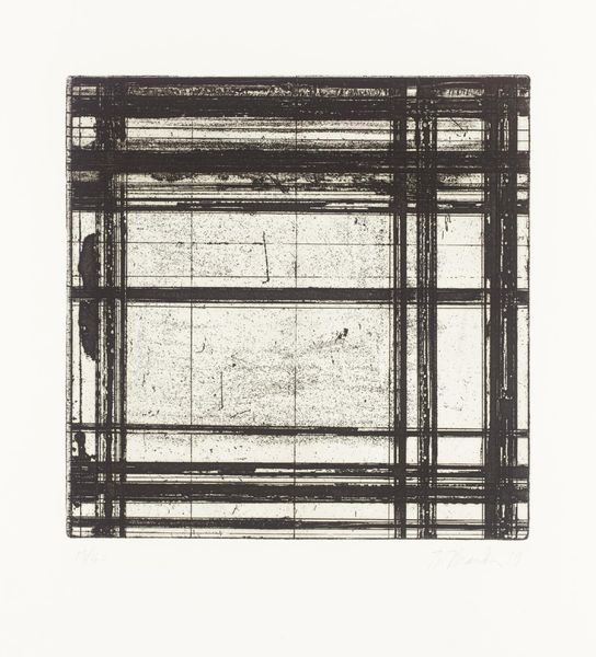 Editor: Mildred Thompson's "Construction," an intriguing print, features stark black and white contrasts. I'm really struck by the almost architectural feel. How do you interpret this work? Curator: I see it as a commentary on the physical act of creation itself. Look at the layering, the way the artist seems to be building up, not just an image, but an entire process. It challenges the traditional hierarchy between the artistic idea and the labor involved in its material realization. Editor: So, you're saying the process of creating the work is as important as the final image? Curator: Absolutely! This piece isn't just *of* a construction; it embodies the very act of constructing, highlighting the labor and materiality inherent in artmaking. Editor: That's a fascinating perspective; it really shifts how I see the piece. Curator: Indeed, thinking about art in terms of labor and materials changes everything.