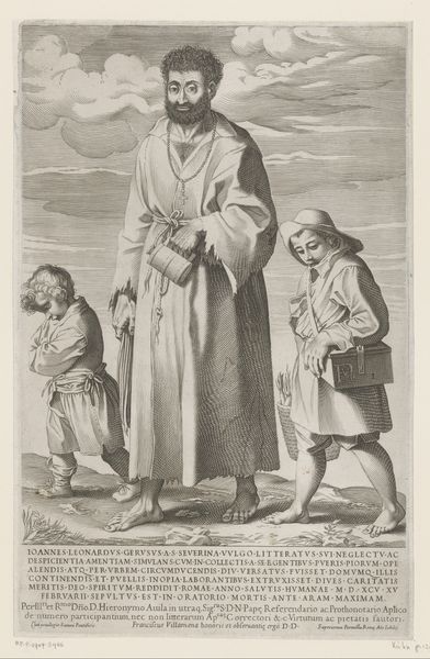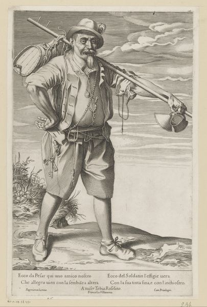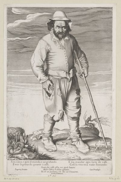 This print of a gardener was made by Francesco Villamena sometime between the late 16th and early 17th century. The artist employed the process of engraving, cutting lines into a metal plate, which was then inked and pressed onto paper. This method allowed for the wide distribution of images, playing a key role in the rise of visual culture. Notice how Villamena used carefully placed lines to describe the gardener's worn clothing, his weathered face, and the tools of his trade – the spade and rake leaning against the ground. The texture of the print is a direct result of the engraver's labor, each line meticulously carved, reflecting the manual effort of both the artist and the gardener depicted. This print is more than just a portrait; it's a statement about labor and class. By choosing a common laborer as his subject, Villamena elevates the dignity of work. The image reminds us of the countless hours of labor required to sustain society, blurring the lines between high art and the everyday realities of life.