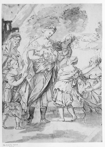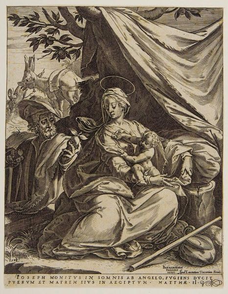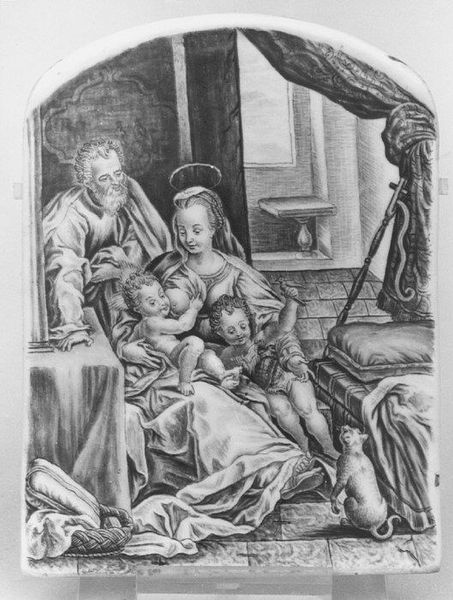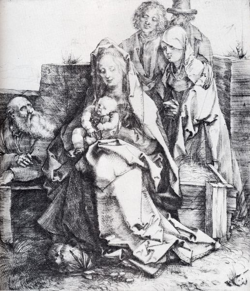 Editor: This engraving is "The Holy Family," by Albrecht Durer. Looking at the figures clustered together, there's a sense of intimacy, even serenity, that's beautifully rendered through the detailed lines of the print. How do you approach interpreting this piece? Curator: I see here a remarkable example of Dürer's mastery of line. Note how he uses varying densities and directions to create form and texture. Consider the folds in Mary’s dress, for example, and how the hatching describes the way the fabric drapes and reflects light. It's almost sculptural. Editor: Absolutely, the contrast is incredible. Is there any symbolic intention in this stylistic approach? Curator: In this northern Renaissance style, it seems the lines aren't just descriptive; they’re almost architectural. Each line contributes to the structural integrity of the composition. See how the lines create planes, define volumes, and ultimately, construct the scene before us. Also, consider how the print medium itself influences our interpretation of Dürer's intention. How does the flatness of the print affect our understanding of space and depth in the image? Editor: That's an interesting point. The lack of color does force a concentration on form and line, creating a very focused viewing experience. It encourages viewers to meticulously dissect the artwork's structure. Curator: Precisely. In analyzing this artwork, the details reveal that each figure is uniquely crafted within a well-defined structural frame that delivers an integrated view. The structure gives life and depth. Editor: Seeing the emphasis on structure and form gives me a new appreciation for the power of line in conveying not just the scene, but also a deeper artistic intent. Curator: Indeed. Shifting our gaze beyond historical context towards pure form unlocks this print's true expressive power.