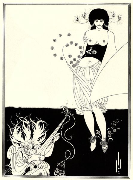 Curator: Aubrey Beardsley’s "The Stomach Dance" presents us with a strikingly theatrical scene, rendered with the artist’s signature bold linework. The figure's body and garb are ornamented with patterns, and the setting is split between the light of the stage and the darkness below. Editor: There’s a tension in the stark black and white, a real sense of performance…almost a confrontation. I'm intrigued by the instrument and the musician positioned down below. What material realities inform our understanding of this composition? Curator: Well, Beardsley engaged deeply with the aesthetic and Decadent movements, using art to question Victorian social norms. The dancer can be read as a figure of transgressive female power, challenging conventional representations of women and sexuality in art at the time. Editor: And we can see how this challenge is materialized through the ink and paper, through Beardsley's deliberate choices to depict both the seductive surface and something potentially subversive. It's a calculated performance, isn't it? Curator: Indeed. This work, housed at the Harvard Art Museums, embodies a powerful intersection of visuality and the politics of representation, echoing debates that still resonate today. Editor: Right. It reminds us that art isn’t just a reflection, but an active player in these conversations.