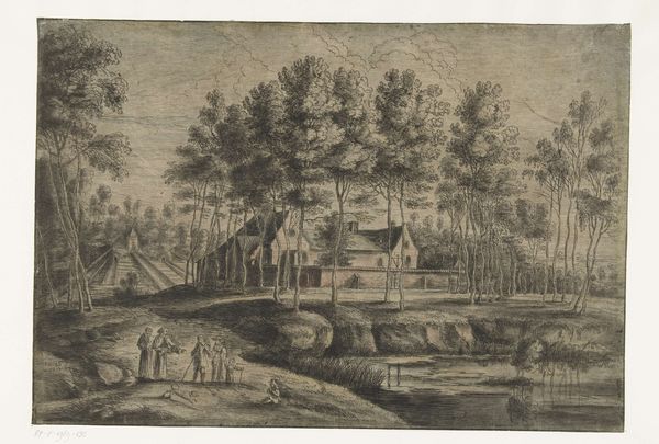 Lucas van Uden created this etching, "View of the Capuchin Monastery in Tervuren," in the 17th century. During this time, the Catholic Church wielded significant power, especially in regions like Flanders where Van Uden lived and worked. The presence of the monastery suggests the pervasive influence of religion on daily life and the social order. We see figures engaged in what appears to be a transaction or exchange, perhaps indicating the economic activities of the monastery or interactions between its members and the local population. The surrounding landscape is a reminder of the relationship between religious institutions and the natural world. This image provides insight into the visual culture of the period and how religious institutions were perceived and represented. The etching invites us to consider the complex relationship between religion, society, and landscape in 17th-century Flanders. It also makes us consider the role of the church in the lives of ordinary people.