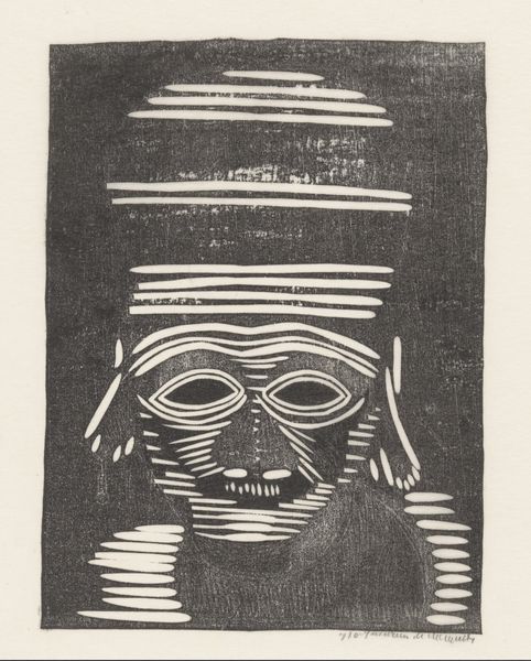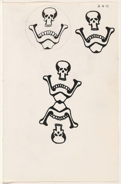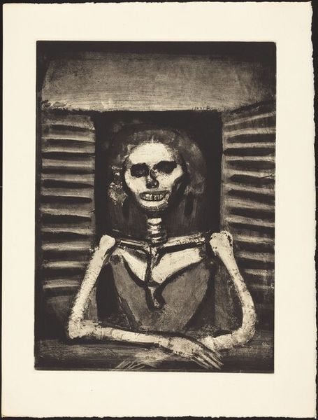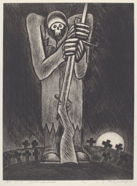 Curator: Here we have José Guadalupe Posada's "Calavera Madero", currently held at the Harvard Art Museums. It measures about 35 by 19 centimeters. Editor: What a striking figure! The cross-hatching creates such a tangible texture—the straw hat looks almost prickly. Curator: Posada was a master printmaker, and this piece, like many of his calaveras, likely started as a zinc etching. These were printed on broadsides and were aimed at a wide audience. Editor: The bottle and sarape draped over the skeletal figure—these are potent symbols of Mexican identity. It suggests a playful yet critical commentary on culture and class. Curator: Precisely! And consider how the printing process allowed for mass distribution, making social satire accessible to the working class. Editor: There's a dark humor here, a memento mori that's also festive. The symbols invite us to contemplate the human story. Curator: Indeed, it makes you consider the labor involved in producing and disseminating these images. Editor: It is a remarkable piece, and the symbols remain quite powerful.