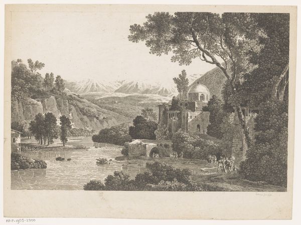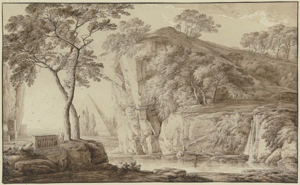 Curator: What a delightfully serene scene. It just whispers "Italy" to me, even though it’s really Theodorus Wilkens's "Southern Imaginary Landscape with Mountains and a Lake," dating from about 1690 to 1748. It's currently residing here at the Metropolitan Museum. Editor: My first impression is quietude. The sepia tones lend a muted, almost melancholic air, a sense of historical distance. I'm struck by the arrangement: foreground hills meet a still lake, a distant mountain looms in the background—the composition seems consciously structured, leading the eye deeper. Curator: Absolutely. The Italian Renaissance clearly had a hold on Wilkens; I bet he was channeling all that poetic drama from way back. He likely sought a harmonious relationship between the human-made elements and the natural world in this piece. Editor: Yes, and consider the texture achieved through etching, ink and tempera on paper. Look how the fine lines of the etching capture details like foliage, creating a complex play of light and shadow across the whole picture plane. It is more than just a landscape, it is almost architectural. Curator: And isn't that the crux of a superb landscape? He gives the eye so many ways in—leading paths, a shimmer on the water...he pulls you right into the scene. What a moment in art to make such scenes of longing in faraway landscapes...that moment seems somehow eternally renewed in art like this. Editor: I agree. The artwork encapsulates the Romantic ideal, this intense longing for the unattainable. Though it's on a smaller scale, its depth, achieved via detail and shading, really pulls the viewer in, creating its own immense reality. A bit of semiotic escapism in monochrome. Curator: You're so right. It's the type of scene that you imagine yourself in while longing to return home after a long day or some even bigger life journey. It's not just pretty; it echoes some deeply human longings. Editor: It's intriguing how an "imaginary" landscape can provoke such genuine feelings and emotions, even after so many years. Curator: Well, thanks to Wilkens' masterful ability to craft a believable dream, we're still standing here talking about it, aren’t we? Editor: Indeed. Thank you for those inspiring words, you made me consider all of this more intimately.