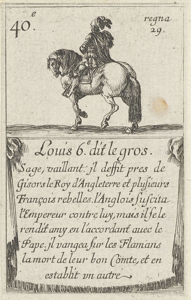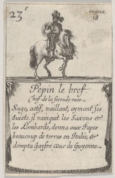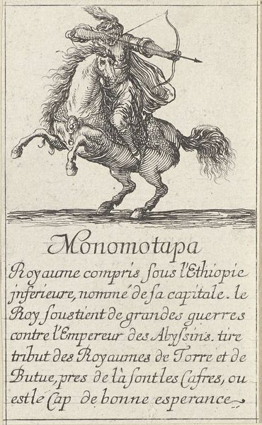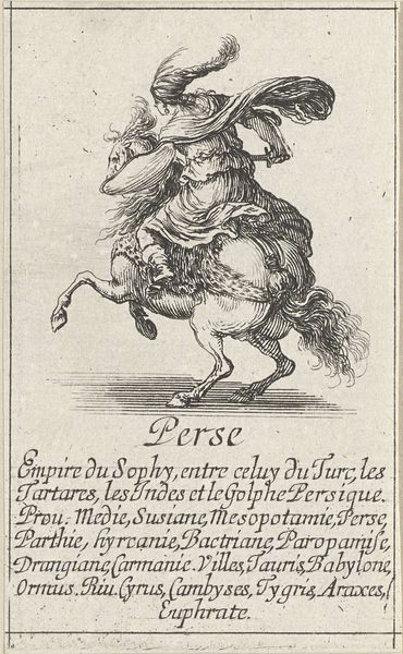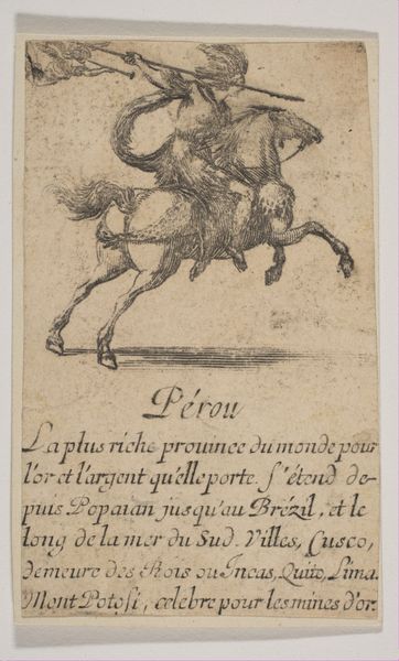 Curator: Look at this playing card, part of a set titled "Jeu de la Géographie," or "Game of Geography", printed in 1644 by Stefano della Bella. This one represents Mexico. Editor: Immediately, what strikes me is the raw energy—that horse is rearing up, the rider looks defiant, ready to strike! But there's also an odd disconnect—it’s all rendered in this rather delicate, almost ornamental, engraving style. Curator: Indeed, the image blends fact with imagination. See the French inscription beneath the illustration, describing Mexico as “New Spain, the most beautiful province of America”? The card highlights Mexico's vast expanse, stretching from the Gulf of California to Yucatán. Editor: But it also betrays a very specific, European view of the Americas, doesn't it? A vision imposed onto a land and its people, framed for the consumption of a European audience playing a parlour game. Curator: Absolutely. Consider the attire of the rider. Is this a European’s romanticized vision of an Indigenous warrior? Or something else entirely? Bella's relying on preconceived notions, visual tropes. Editor: It really does point to the way power structures and imperial ambitions get embedded in even the most seemingly innocuous objects, like playing cards. What’s shown, but even more so, what isn’t? Curator: Exactly. By reducing a complex land to a single image, complete with a simplified geographical blurb, it speaks volumes about the European mindset of the time, their desire to categorize and contain the 'New World'. Editor: These aren't simply geographic representations; they're loaded cultural documents. This card asks us to look at how societies perceive each other, how history is constructed and circulated. It makes you wonder about the visual culture they developed independently. Curator: Precisely. It is fascinating how seemingly trivial items reflect deeper cultural biases. Editor: A playing card—such a simple thing, yet a lens into complex power dynamics of the 17th century.