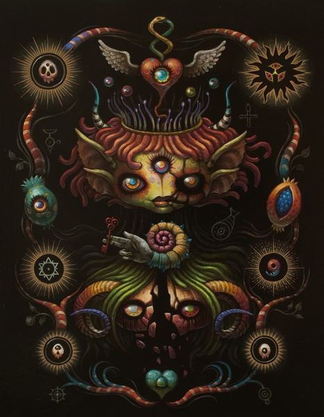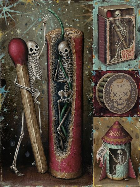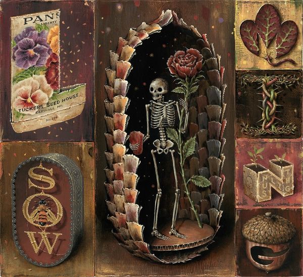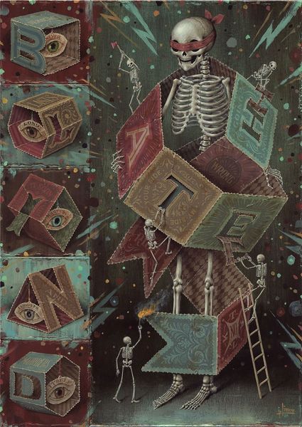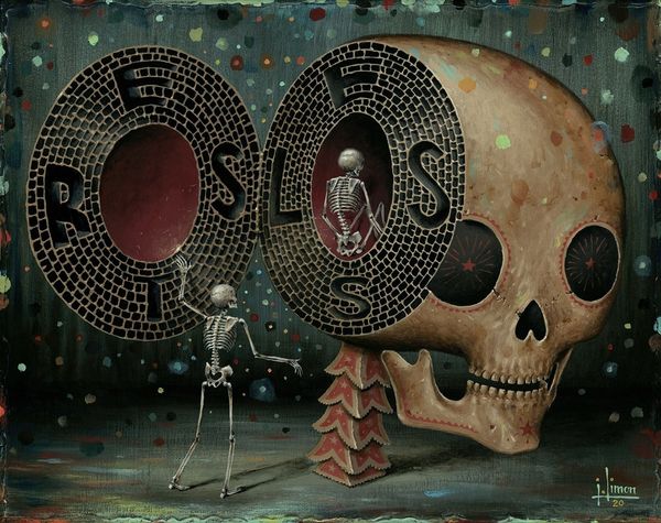 Jason Limon’s enigmatic painting, "Sign of Life," presents a visual riddle rendered with the precision of an old master. The composition, a grid of symbolic objects framing a central skeletal figure draped in a death's-head moth, balances the macabre with a whimsical charm. The muted color palette, punctuated by moments of red, creates a somber yet inviting atmosphere. The materiality of the painting, with its smooth surfaces and detailed textures, lends a tactile quality, almost begging the viewer to decode its secrets. Limon’s semiotic game unsettles conventional understanding. The objects, like the snake spelling 'S', and the battery next to 'F', seem to spell a message, hinting at cycles of decay and renewal. The figure itself, a skeleton adorned with rabbit ears, challenges fixed meanings, oscillating between life and death, innocence and mortality. This tension between order and ambiguity invites us to question the very signs we use to make sense of the world. The work functions as more than an aesthetic object; it is a cultural artifact reflecting our enduring fascination with mortality and the unknowable.