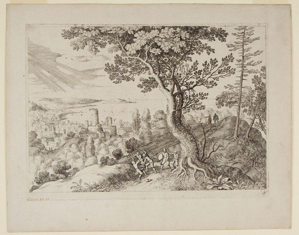 Editor: This etching, Horseman and Traveller in Valley of a Brook by Matthäus Merian the Elder, is so detailed. The landscape feels both wild and cultivated. What do you make of the contrast between the figures and the overall scene? Curator: Notice how the process of etching allows for this incredible detail, mimicking the textures of the natural world and the fabrics of the figures’ clothing. Consider the socio-economic context of printmaking at the time – it allowed for wider distribution of imagery, connecting the artist's labor to a broader market. Editor: That’s a cool perspective. So, you’re thinking about how the work’s materiality impacts its role in society? Curator: Precisely. The material reality of its production and consumption shapes its meaning. Printmaking democratized art, impacting both artist and consumer. Editor: That's a way of looking at the artwork I hadn't previously considered. Thanks! Curator: Indeed, observing the means of production gives us a new appreciation for art.