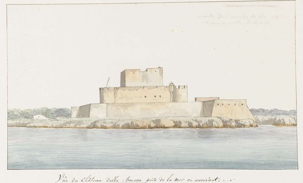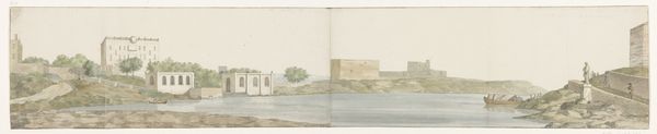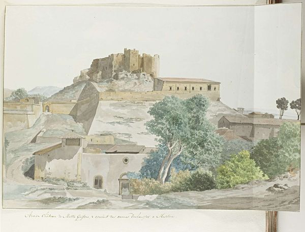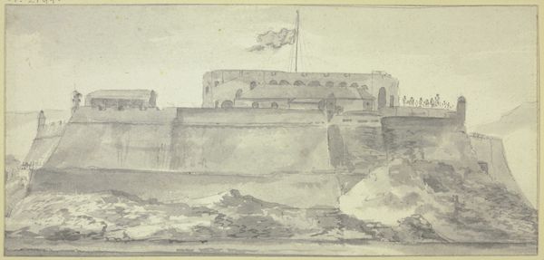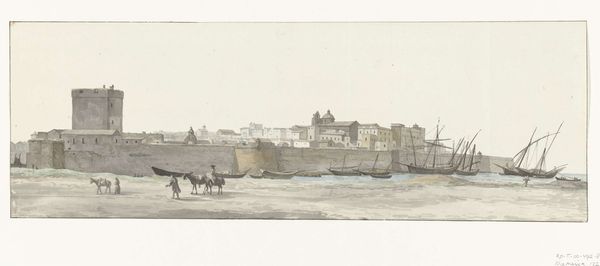 Editor: So, here we have Ducros's "View of Gallipoli", a watercolour from 1778. The buildings look so solid, especially contrasted against the wispy sky. How would you describe the mood this evokes? Curator: Ah, Ducros. He had a way of capturing the *sense* of a place, didn't he? For me, this isn't just Gallipoli, it's almost a stage set for the idea of Gallipoli. Do you notice how the strong, solid forms create a theatrical sense? It’s almost like history painted on a backcloth, inviting us to imagine what grand stories this location is witness to. Editor: That's an interesting way to look at it, a stage set. I hadn't really considered that. Is that play between fact and fiction common for this time? Curator: Absolutely! Remember this is Neo-classicism. It’s not just about portraying reality. What about those little figures down there on the lower right? How do they make you feel? Editor: They’re really small in scale, but now that I’m paying more attention, I realize that it's interesting they included a couple of the local inhabitants. What purpose do they serve here, do you think? Curator: Indeed. For me, they anchor us to human scale and at the same time, because they seem so oblivious to what the buildings behind them have represented historically. They create an amazing tension. The past is so omnipresent and we continue in our every-day existence... almost painfully mundane in comparison. Isn't it delicious? Editor: That's fascinating; I am really understanding how Ducros is placing Gallipoli within a context that invites us to consider the weight of its historical importance. Curator: Exactly! And think about his technique - loose watercolor washes. It feels immediate, fresh. This feels to me like a reminder that every grand narrative has moments of fleeting, human experience tied inextricably to them. Editor: Thanks, that helps so much. I see that it has all those layers now!