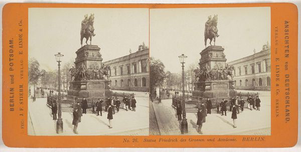 This photograph of the equestrian statue of Frederick the Great was made in Berlin by Johann Friedrich Stiehm. It's an albumen print, a common process in the 19th century. The photograph itself is a commodity, and the image it depicts, a Prussian king, shows the close relationship between production and power. The albumen process involved coating paper with egg white and then a silver nitrate solution, making it light-sensitive. The negative was then placed on the paper and exposed to sunlight. The resulting print has a smooth surface and a wide tonal range, capturing the details of the statue and the surrounding architecture. The photograph’s materiality—its reliance on both skilled darkroom work and mass manufacture – highlights its place in a rapidly industrializing society. Stiehm’s photograph reminds us that even seemingly straightforward images are the result of complex social and economic forces. It encourages us to look beyond the image itself and consider the labor, materials, and technologies that made it possible.