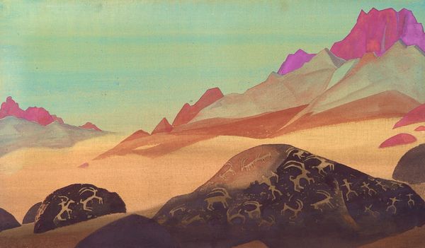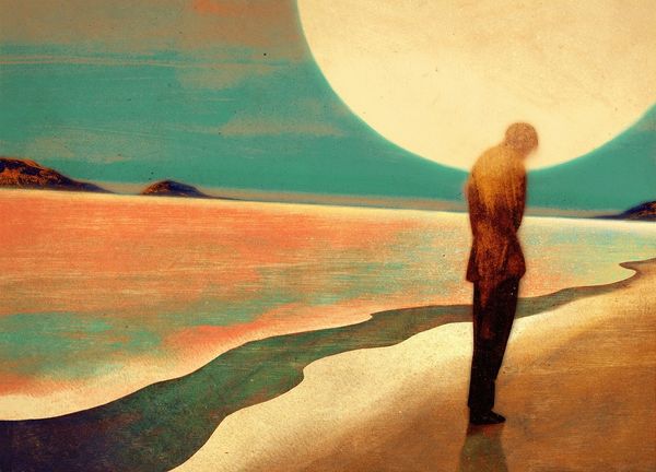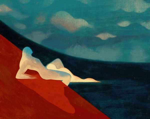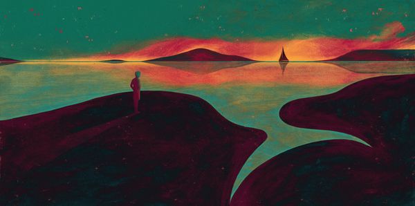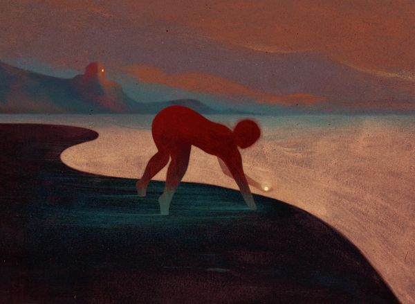 Editor: We’re looking at “Tente,” a mixed-media piece created in 2021 by Owen Gent. It strikes me as deeply introspective. The muted palette and solitary figures give it a somewhat melancholic feel. What do you see in this piece? Curator: The power here lies in the symbolic use of the landscape. Notice how the hills become almost anthropomorphic; a reclining figure, perhaps? The silhouette could suggest the sleeping giants of folklore or even the very land holding memory, trauma, and potential. Editor: I hadn't considered the landscape as a figure itself. The two people, one walking, the other standing still – what could that signify? Curator: Are they separate, or perhaps aspects of the same individual? The journey versus the moment of contemplation. The walker might embody action, the active pursuit, while the standing figure could be acceptance, awareness of place, or a facing of internal challenges. Note also that we find ourselves implicated. Look at the colour changes as symbolic emotional registers, deepening, from the horizon to where the image emerges toward the viewer: a landscape into which we may project our states of being. Editor: That's a fascinating perspective – seeing them as two sides of the same coin, and placing the viewer in their path! Curator: Exactly. Art often holds mirrors to our inner states and uses symbols of culture to give form to feeling, providing frameworks to know how people came before you. Editor: This has made me think about how we all carry our own internal landscapes, and the figures within them. Thanks, this was incredibly helpful! Curator: It was my pleasure, I learned something, too. Symbolism helps us decode what is lasting.
