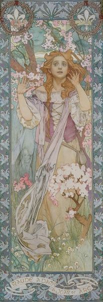 Curator: Hello! Editor: We’re looking at Alphonse Mucha's 1898 mixed-media poster, "La Dame aux Camélias." It’s incredibly striking, I immediately think of vintage elegance, but with an otherworldly twist, all flowing lines and pastel colours. What stands out to you when you look at this piece? Curator: Ah, Mucha! He whispers secrets of another age. I'm drawn to how he uses line, almost like a dancer's gesture, to capture not just likeness, but feeling. Notice the subtle sadness in her downcast gaze, amplified by the fragility of the camellias themselves. The camellia in the image, traditionally symbolizing love and sacrifice, is a key clue to unlocking this poster’s mood, wouldn’t you say? Editor: I do see it now! But I hadn't initially picked up on that. I was more drawn to the decorative aspect. It’s interesting you focus on the sad gaze and sacrifice. That definitely gives it a whole other layer. Curator: Mucha was brilliant at layering. He lulls us in with beauty, then subtly introduces complexities. Did you know this was a poster for a play starring Sarah Bernhardt? Consider that connection – the constructed nature of theatre influencing his artistic choices. It makes me wonder: how much is Sarah playing a role here? Editor: So the elegance is intentional, performative almost. It completely shifts my understanding from passive admiration to active questioning! Curator: Precisely! And isn’t that what art should do? Provoke and entice. It encourages a delightful blend of observation and introspection. It reminds us how looking at art isn't just *seeing* but truly *feeling.* Editor: It is beautiful how different our experiences with a single image can be and still coalesce into something meaningful! Curator: Yes! Like divergent paths leading to the same breathtaking view. Until our next exploration!