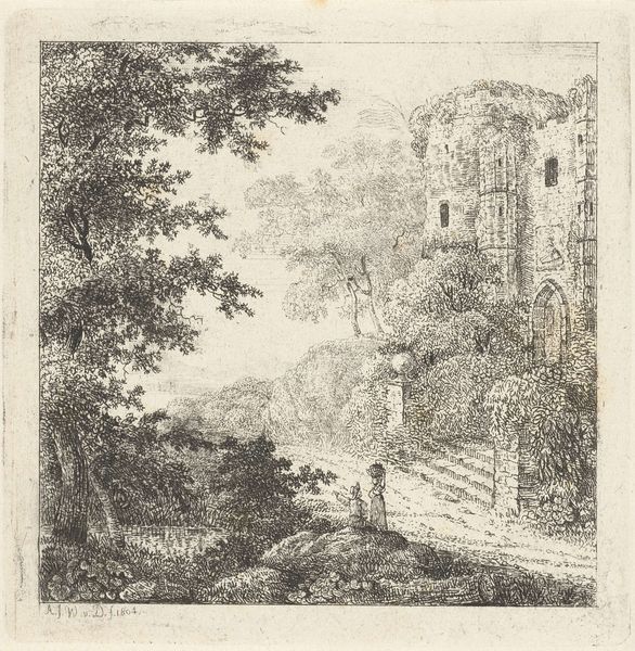 Editor: This is "Vrouw met kinderen bij een ruïne van een monument," or "Woman with Children at a Monument Ruin" by Franz Edmund Weirotter, from 1760. It's an etching on paper. It’s quite striking, this contrast between the timelessness of the monument and the everyday life of the people beside it. What do you see in this piece? Curator: I see the politics of imagery playing out in miniature. The ruin represents a classical past, a symbol of power and empire. But its decayed state hints at the transience of such power. And placing a genre scene, a 'snapshot' of ordinary people, directly in front prompts us to question whose stories are typically centered in history, and by whom? Editor: So, the artist is intentionally juxtaposing these grand historical narratives with the lives of everyday people? Curator: Exactly. And consider where something like this would be viewed in 1760. It's a print; it would be relatively accessible, unlike a massive history painting commissioned for a palace. Prints allowed for broader circulation of ideas. By putting this intimate family scene against the backdrop of fading grandeur, the artist makes the past less remote. Does the woman by the ruin seem aware of it? Does she have any agency in relation to the historical relic that may be larger than her experience? Editor: That makes me think about the accessibility of art back then. Making a statement, but who's able to receive it? Maybe this touches on the purpose and meaning we associate with art that may be inherently unavailable for certain groups. I never thought of prints in that way before. Curator: It is this democratizing aspect of prints which brings visibility and invites interpretation from a greater audience. Editor: That's such an insightful way to look at this print. I really appreciate learning about this from you. Curator: It has been a pleasure to share with you. Seeing through different lenses certainly expands my thinking about art too!