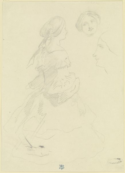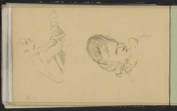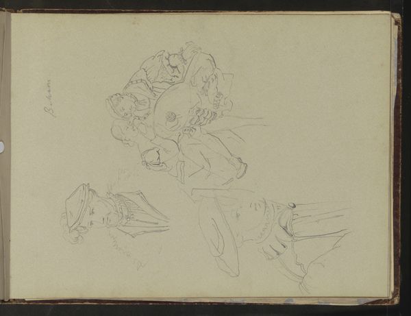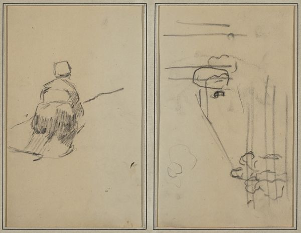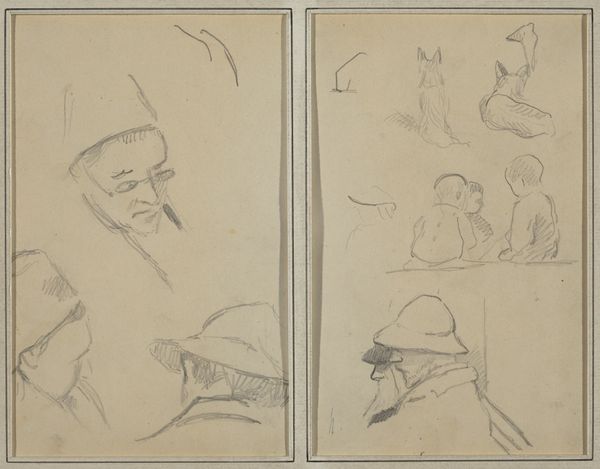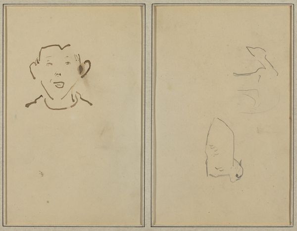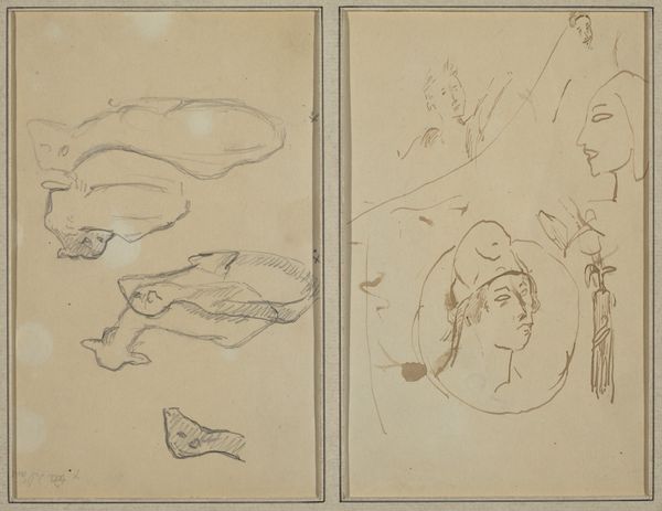 Editor: Here we have "Eye and Part of Face; A Breton Woman and Two Men," a drawing by Paul Gauguin created sometime between 1884 and 1888. It feels so intimate, like a glimpse into a sketchbook. The isolated eye is quite striking! What do you make of it? Curator: Ah, Gauguin! It's like stumbling upon a private moment, isn't it? The direct gaze of the woman on the left, the unfinished nature of the surrounding sketches – it whispers of capturing fleeting impressions. I find it fascinating that he isolates the eye. Perhaps he’s asking us to really *see*, beyond the surface, beyond conventional portraiture. Do you get a sense of place from these figures? Editor: Brittany, right? Gauguin's time there, his interest in capturing local culture... The simplified lines, they feel so modern for their time. How much was he consciously moving away from traditional art at this stage? Curator: Precisely. Gauguin was, after all, searching for something 'authentic', far from the perceived constraints of Parisian art circles. See how the quick strokes imply form, but don't rigidly define it? This sketch is, in a sense, a record of a search, a feeling out. It almost has an unfinished and "I wasn't quite happy with it" feel. Is there anything particularly poignant for you? Editor: That makes a lot of sense. The 'authenticity' angle gives another perspective. For me, I think that singular eye really does it. A lot is happening right there. I thought I was looking at a snapshot from some distant place and time, but, really, maybe that face in the foreground is telling us more than we even know. Curator: Precisely, its appeal transcends what we see. And the very sketch-like essence hints at something deeply rooted, and maybe yet to grow, as a representation of art in general! I find myself wondering what Gauguin would have said if he were here!