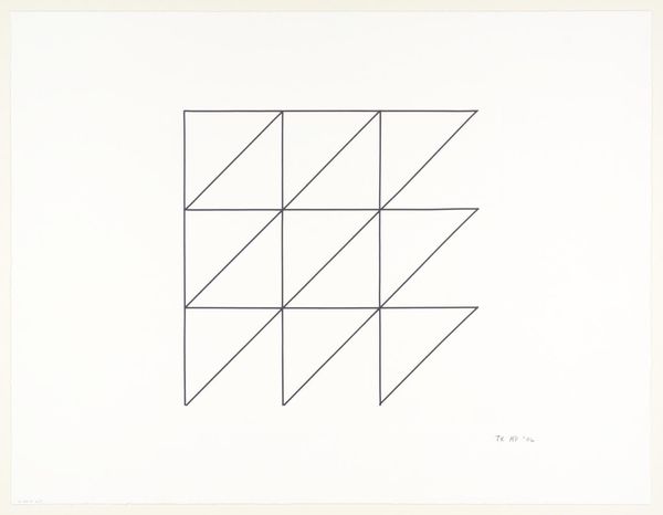 Curator: Here we have Sol LeWitt's "Incomplete Cube," a drawing from 1974. It's striking in its simplicity. Editor: Yes, I'd say simplicity verging on austerity. My initial reaction is a feeling of unease, that something's not quite right, almost like a diagram for something impossible to construct. Curator: Well, consider LeWitt's emphasis on the idea, the concept, over the finished product. He often used assistants to execute his wall drawings and structures. It's less about a precious art object than it is about labor and execution following clear instructions. In this case, you know, he is taking a pencil to paper and outlining a basic incomplete form. It seems like a rudimentary task, really. Editor: That incompleteness is very potent, though. Cubes in general, in art and in our minds, symbolize stability and solidity. This fragmented cube could symbolize, through its negative space, concepts of imperfection and instability in life and existence, something that perhaps deeply affected society during the time it was made, after the turbulent '60s. Curator: Interesting point. We might also read that as him taking the cube as the base unit, deconstructing it, and putting it in dialog with seriality and progression and labor that can be replicated according to rules or sets of instructions. The work becomes less about pure aesthetic form and more about a visual system, the idea made tangible through process and repeated production. Editor: But it's precisely through its stark reduction and careful presentation that the artist communicates so effectively. LeWitt has, in a sense, constructed his cube like an ideogram, making its symbolic essence all the more readable. Even viewers without knowledge of Minimalism would feel it in their bones. Curator: Absolutely. It shows how seemingly basic forms, line, and spatial representation, still embody such depth when we think about their manufacture, and meaning to others in the process. It brings forth so much that remains to be analyzed. Editor: I'll carry that sentiment forward with the knowledge that geometric figures, no matter how simply presented, carry such a weight and history.