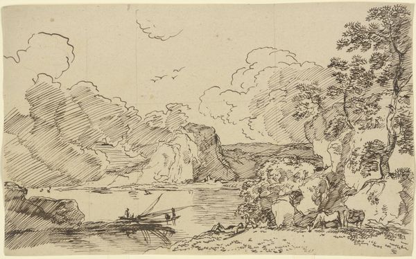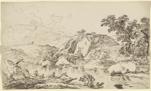 Curator: Right, so this is “Landscape, a mountain to the left, bushes, a valley in the background to the right," an ink drawing by Vincent van der Vinne. It lives here at the Städel Museum. It has a very '18th century Netherlands' vibe, doesn't it? Editor: It feels delicate. Sparse, even. It’s almost as if the landscape is holding its breath, waiting for the rest of the picture to materialize. It really plays with the light...or lack thereof. Curator: Exactly! And Van der Vinne's linework here, with the ink, gives such an ethereal feel. You can sense the airiness of the space. Editor: Absolutely, but how much of that "airiness" speaks to the artistic conventions, the societal constraints imposed on artists at the time? Were artists even able to represent nature in any way they desired? Or were they guided and steered by patrons with a financial and ideological investment? Curator: That's a compelling way to think about it. Perhaps he was bound by the market's taste for ordered landscapes, which is so much what wealthy patrons liked to display... However, that steep craggy cliff to the left, and that sense of freedom in the handling of the brushstrokes...that seems a bit more like something untamed. It feels like Van der Vinne really knew how to work around limitations to introduce some genuine personal touches into his pictures. What do you think? Editor: Well, I do find a curious ambivalence in the composition; it has its roots, like you pointed out, in older modes of representation that favoured harmony, yet at the same time hints at something other, a disquiet beneath the calm surface, where perhaps, ideas and artistic possibilities might sprout in later generations of Dutch artists. Curator: Mmh. Maybe that cliff represents that crack where the wild ideas seeped in... Maybe it's the portal. Editor: In a sense. So this is not merely an appealing vista. It is the intersection between established tradition and change; and by appreciating this push and pull, the drawing then can come alive, even for the visitor. Curator: I love that! It feels like this drawing can grow, constantly change...like nature itself!