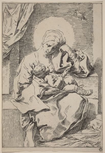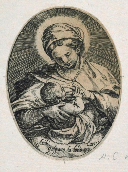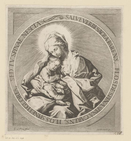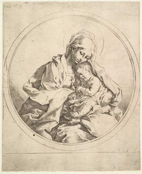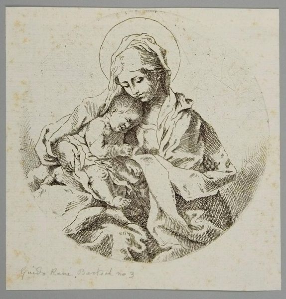 Curator: Right now, we're looking at "The Virgin holding the infant Christ, a circular composition, after Reni," dating roughly from 1595 to 1645. It's an engraving, here at the Met. Editor: Oh, my goodness, look at the tenderness in their faces. She's gazing down, and the baby’s asleep, totally trusting. It’s like a circle of love, quite literally framed that way. Curator: That circular composition is really key. It lends itself to that intimate, enclosed feeling. Reni was known for his classicism, and even in this print after his work, you see the echoes of the Italian Renaissance ideals – harmony, balance. But the softness is pure Baroque. Editor: Absolutely. And considering the historical context, it’s hard not to think about motherhood in that period. The Virgin as the ultimate symbol, but also, what did it *mean* to be a mother, a woman, then? All those societal constraints, expectations... Did art offer a form of agency, of visibility? Curator: It's fascinating, isn’t it? To me, it's about universal human connection, that almost primal bond. There’s an aura of tranquility here, even though the medium—engraving—is so precise, so deliberate. Look at the detailed lines in her draped clothing! Editor: True, but it’s impossible for me to divorce art from power structures, and what images are circulated, by whom, and for what reason. Even something as seemingly sweet as the Virgin and child carries heavy ideological weight. Is this promoting a kind of docile femininity, an unrealistic ideal of maternal perfection? Curator: Maybe, but I also think art can hold multiple truths, multiple readings. It’s a starting point, a reflection. The image, I feel, creates a shared experience. I find peace here. Editor: And I find questions. Both are valid, I think. That tension is what makes it stick with us. Curator: Beautifully put. A conversation that spans centuries. Editor: Exactly. And hopefully provokes a few more in the here and now.