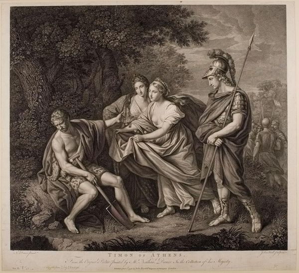 Editor: This is Francesco Rosaspina's "Abraham and Three Angels." It's a very classical composition. What strikes me is the contrast between the figures' dynamic poses and the stillness of the landscape. What do you see in this piece? Curator: The artist's use of chiaroscuro creates dramatic tension. Observe how the stark contrast emphasizes the physicality of the figures. Consider the implications of the balanced composition, the relationship between the earthly and the divine. How does it make you feel? Editor: It feels very formal, balanced. Curator: Yes. Rosaspina’s employment of line contributes significantly to the work’s overall impact. It underscores the classical ideals. This print showcases a mastery of technique, emphasizing the formal elements over pure narrative. Editor: It’s interesting how focusing on those elements, instead of the story, changes my perspective entirely. Curator: Indeed. Shifting focus unveils the structural rigor.