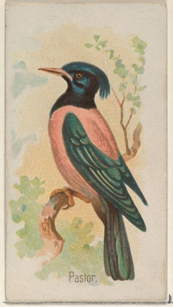 Editor: This is a print entitled "Merle Violet, du Royaume de Juda," by an artist known as Matinet. It looks like it's rendered with etching and watercolor. What I find most striking is the way the bird is depicted, almost as a caricature, yet the botanical details are quite precise. How do you interpret this work? Curator: Well, looking at it historically, these kinds of prints were popular during a time of intense scientific exploration and colonization. The detailed rendering, as you pointed out, serves a purpose. They weren’t just artistic endeavors; they were attempts to document and classify the natural world, to lay claim to knowledge about these newly "discovered" species. Editor: So it’s more than just a pretty bird picture. Curator: Precisely! Think about the title: "Merle Violet, du Royaume de Juda." "Royaume de Juda"—the Kingdom of Judah. It links the exotic, newly cataloged natural world with historical and often biblically-referenced geography, lending an air of authority, but also perhaps inadvertently hinting at appropriation. Where was this meant to be viewed? Editor: Probably in a book or a collection owned by a wealthy patron, maybe? Curator: Exactly. These images circulated within specific social and intellectual circles, reinforcing power structures and contributing to the era’s imperialistic gaze. And look at the strong yellow border; does it look like a frame or a cage? Editor: It does feel a bit like a cage now that you mention it. It definitely changes my perception of the artwork, from a decorative piece to something with complex social implications. Curator: And that is the beauty of art history. It shows us how art is so enmeshed within society.