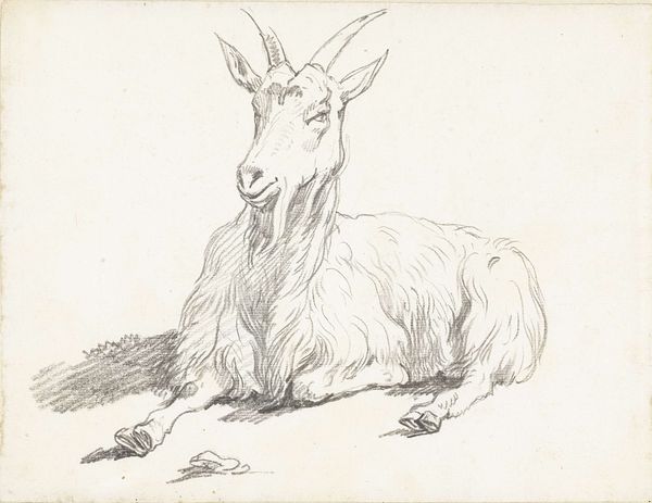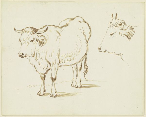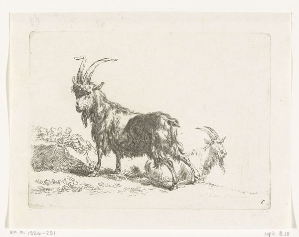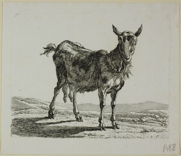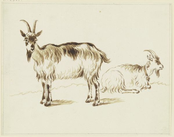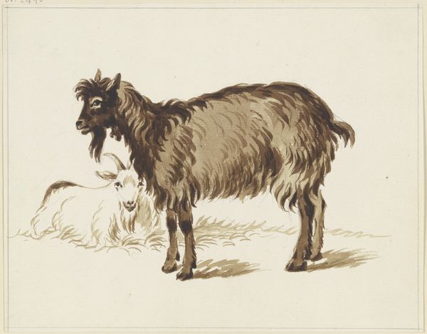 Editor: We're looking at "Standing Goat to the Left", a drawing using ink, possibly indian ink, by Friedrich Wilhelm Hirt. It’s currently housed in the Städel Museum. I am struck by the seeming realism, almost photographic quality in rendering the goat's form and texture. What do you notice, and how would you approach interpreting it? Curator: Indeed. From a formalist perspective, it's fruitful to begin with the interplay of line and wash. Observe how the artist has utilized varied line weights to define the contours of the animal, lending it a sculptural presence. Consider, too, how the washes of ink, modulated in tone and density, delineate the areas of light and shadow, articulating volume and texture. Where do your eyes lead you within the composition, and why? Editor: I’m drawn to the detailed rendering of the goat’s head and horns, perhaps because of the greater contrast there. Curator: Precisely. Note how the tight concentration of fine, dark lines in the head draws visual interest, while the washes delineate the bulk of the body. Does this strategic contrast guide your interpretation of the artist's intent? Is this merely a study of an animal, or could the meticulous execution point to a broader symbolic intent through careful artistic representation? Editor: I hadn't considered the possible symbolic dimensions. I was simply captivated by its apparent realism! Your emphasis on formal qualities has broadened my thinking considerably. Curator: Focusing on artistic elements allows for an intricate dialogue between what we observe and what it conveys. I’m pleased this conversation altered how we think about realism in a piece like this one.