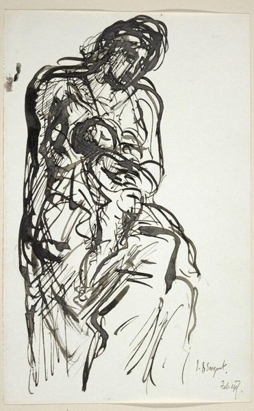 Curator: We're standing before Franz Kline's "Self-Portrait" from around 1940, an ink drawing that hints at the artist's interior world. Editor: Wow, it hits you, doesn't it? Raw energy. Feels almost violent, yet intensely personal. Like a soul turned inside out. Curator: Kline was deeply influenced by the sociopolitical turmoil of his time, particularly the rise of fascism and the looming war. His abstract expressionism became a way to express the anxieties of a world on edge, reflecting the fractured identities that war and displacement created. This self-portrait, with its bold strokes and obscured features, suggests that breaking down of identity. Editor: Fractured is the word. It’s like he’s building up a face and tearing it apart at the same time. Is he wrestling with something, some inner demon? The harsh black ink almost smothers the paper. It’s beautifully disturbing. Curator: Art historians see in this work, and others from this period, Kline's engagement with existentialist thought. The individual confronting an absurd, meaningless world. The act of creating these bold, yet ultimately abstract, representations was itself a kind of assertion of agency. Editor: Absolutely, it feels like a scream bottled up then released in one go. It's not pretty, it’s real. Does it feel vulnerable, or powerful? Both? Like, "here's me, exposed", but "try and make sense of me." Curator: Considering his later works, it's tempting to see in this piece an early grappling with the relationship between representation and abstraction, where recognizable forms break down and are reconstructed into powerful expressions of the inner self. Editor: It’s a fantastic reminder that even the boldest brushstrokes can begin with a quiet, maybe tortured, self-reflection. And those stark blacks hide a universe of emotional color. It’s really powerful to think of Kline’s future gestural abstractions having roots here. Curator: Absolutely, a crucial work for understanding the development of Kline's abstract language and his engagement with the anxieties of his era.