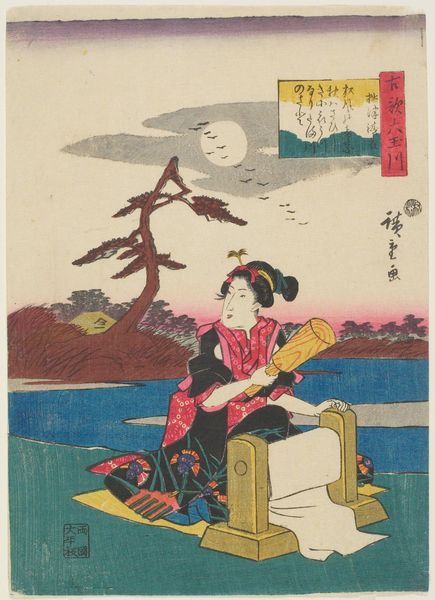Totoya Hokkei created this woodcut print, "Zoutwaterputten," in Japan during the late Edo period. The print captures a scene of labor and leisure set against a coastal landscape. Here we see two figures engaged in the task of drawing seawater, a laborious task that reflects the working-class realities of the period. The figures' clothing and tools suggest their socio-economic status, offering a glimpse into the lives of ordinary people in Edo society. Hokkei's decision to depict this scene challenges traditional representations of idealized beauty, and instead he shows a more complex and nuanced view of everyday life. Notice how the figures interact with their environment as they navigate the shoreline with a backdrop of a serene sunset. The integration of poetry hints at deeper cultural meanings and emotional resonance, adding layers of complexity to the artwork. Hokkei invites us to reflect on the intersections of labor, nature, and human experience within the context of Edo society. This print reflects the social dynamics of the time while inviting contemplation on our own connections to place and purpose.