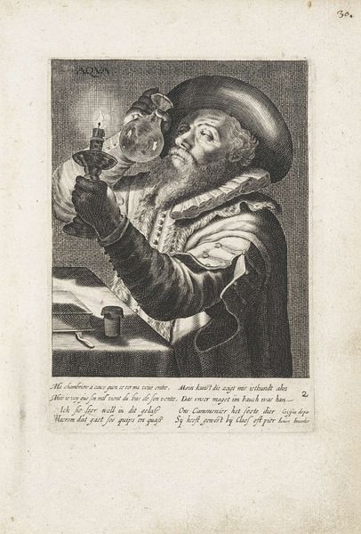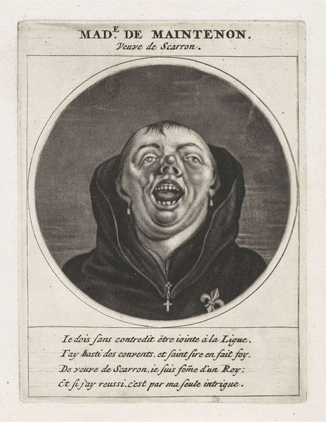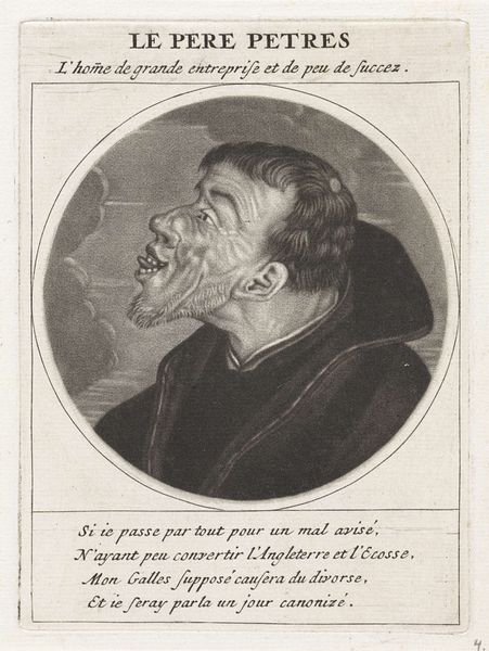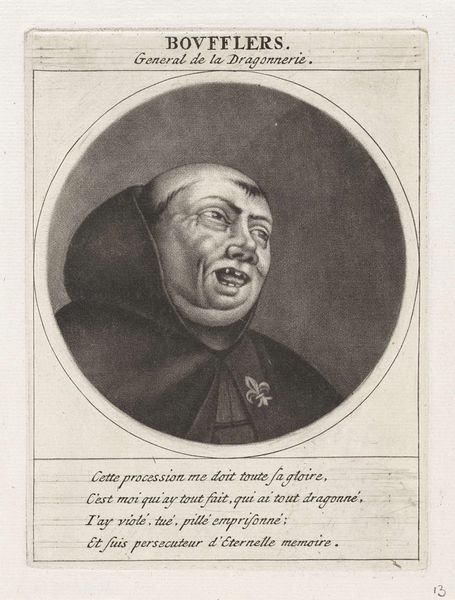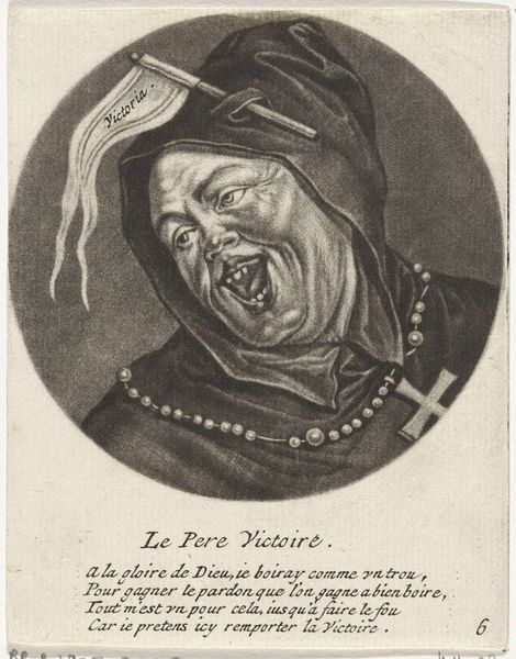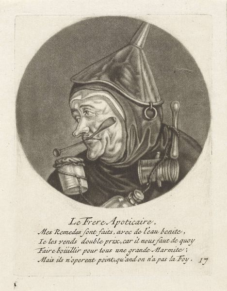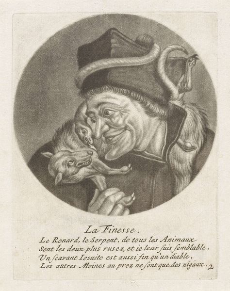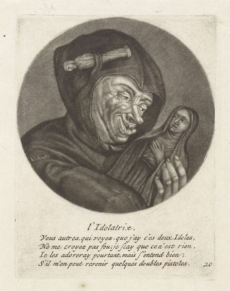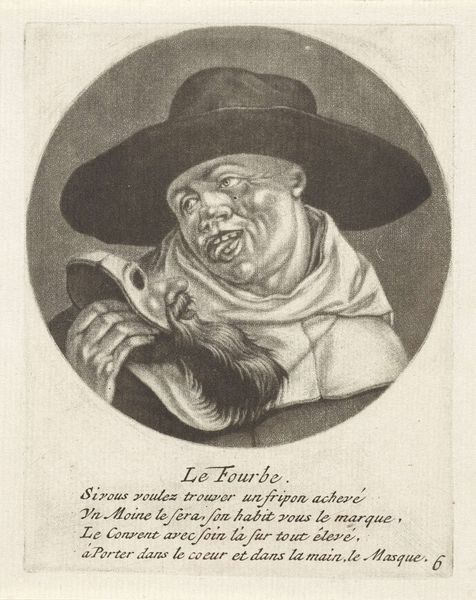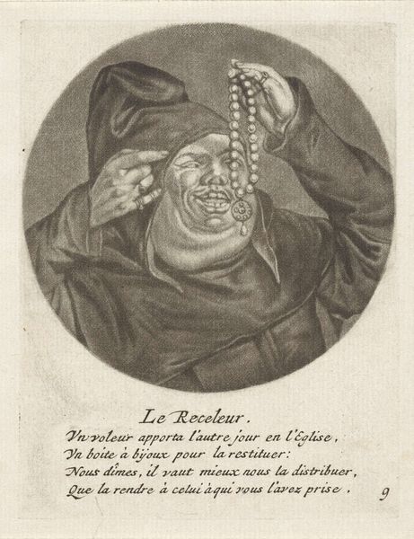 Curator: This engraving, possibly from between 1670 and 1724, by Jacob Gole is titled "Monnik met een makreel"—"Monk with a Mackerel," which currently resides at the Rijksmuseum. It is part of their print collection. Editor: What strikes me immediately is the character's blatant joy, contrasting oddly with his monastic garb and, of course, that prominent fish. The monochrome allows a focus on material textures. Curator: Absolutely, and it's important to consider the social commentary inherent in this piece. The gleeful expression challenges conventional perceptions of religious figures, perhaps suggesting hypocrisy. The act of holding a fish, presented almost as a prized possession, introduces elements of class and economic transaction into a scene one might traditionally associate with solemnity. Editor: I’d say it is hard not to think of materiality here too. It is really all about surface – what is being shown on the outside, versus the implied realities beneath. Look at how carefully rendered the scales of the fish are! And in comparison, what about the fabric of the monk’s robe, where its folds suggest a life lived in relative luxury. Curator: This is very good point! Also we should think about it beyond face value – this artwork offers interesting commentary on religious roles within Dutch society and the social impact this religious positioning brought during the Baroque. What's presented as devout, as righteous, can very easily be performative or driven by far more earthly needs and interests. Editor: Considering the process and materiality really lets you zoom in on what I think is at play here: social performance as labor. I would argue that its success relied heavily on very specific codes and representations. The way Gole engraved the piece underscores those themes beautifully – he turns social currency and economic status into a tactile thing we can sense. Curator: I agree! Editor: For me this dive has made clear that artworks such as “Monk with a Mackerel” aren't about simply capturing life, it's using art to actively scrutinize it! Curator: Precisely! I found it's the way this challenges and transforms notions of Baroque social piety through a focus on character that stays with me.