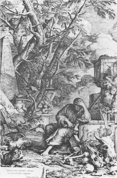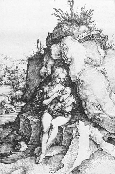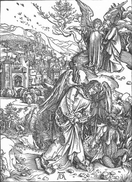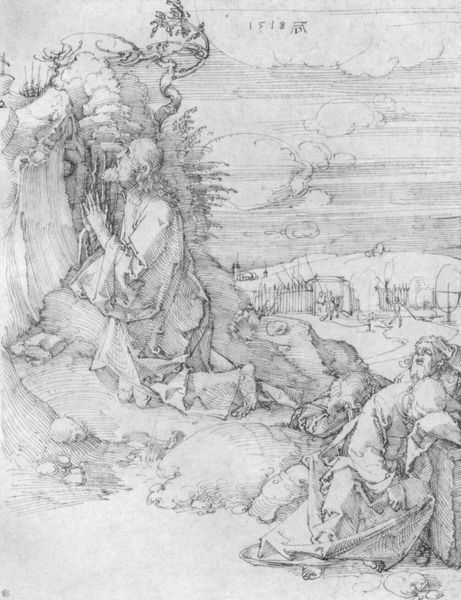 Albrecht Dürer created this scene of Christ on the Mount of Olives using an engraving technique. The composition is strikingly organized around a central, illuminated Christ, contrasted by the dark, slumbering forms of his disciples. The stark black and white medium enhances the emotional weight, drawing the viewer's eye through meticulous lines and textures. Dürer masterfully employs line to build both form and symbolic meaning. The chaotic, almost frantic lines surrounding Christ, versus the smooth, curved lines defining the sleeping disciples, visually distinguish spiritual turmoil from earthly slumber. The landscape is not just a backdrop; it's an active participant in the drama. Trees and foliage are rendered with such detail they seem to echo the emotional complexity of the scene. Dürer's choice of engraving, with its capacity for precise detail and stark contrast, reflects the philosophical tensions of his time, poised between the medieval and the Renaissance. The medium itself becomes a statement, emphasizing clarity and detail against the ambiguity of faith. It captures a pivotal moment of struggle and surrender.