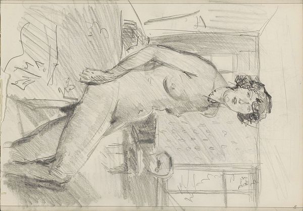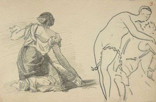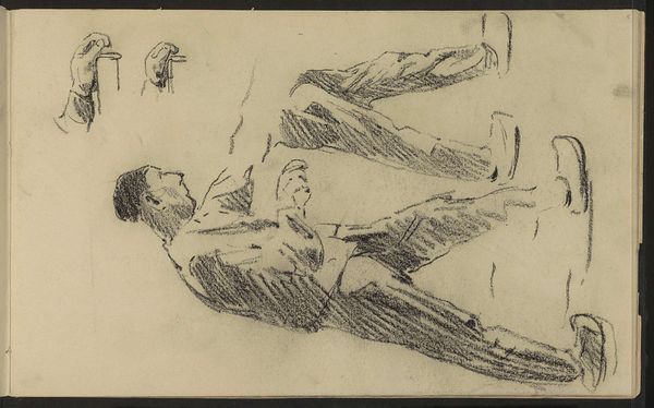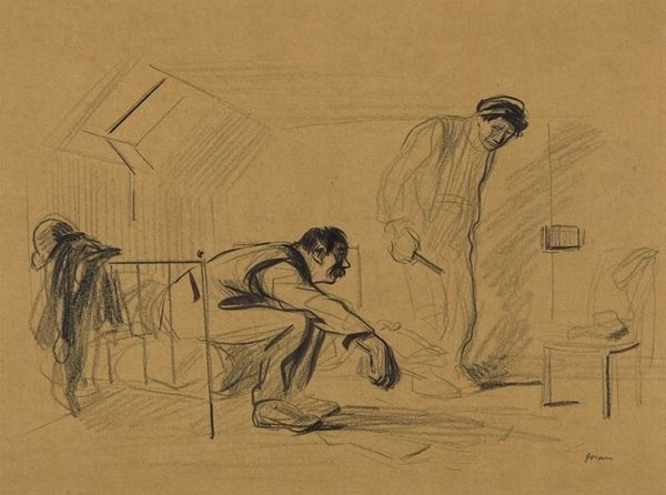 This is John Singer Sargent's drawing, Couple on a Cot. The loose and sketchy style gives the work an intimate and informal feel. Notice the use of graphite to create varied tones, from light shading to dense, dark areas, giving the figures depth and volume. The composition divides the scene horizontally. The top half is more densely worked, focusing on the male figure's clothing and the shadows, while the lower half of the cot, with the dangling leg, fades into the background. The figures, though close, do not interact visually, and are presented in a way that reveals a psychological distance. Sargent often captured fleeting moments, suggesting a narrative without explicitly defining it. The sketchiness destabilizes established meanings, and the lack of detail invites us to project our own interpretations, underscoring the subjectivity inherent in viewing and understanding art. It is through such formal qualities that the drawing invites ongoing interpretation and personal connection.