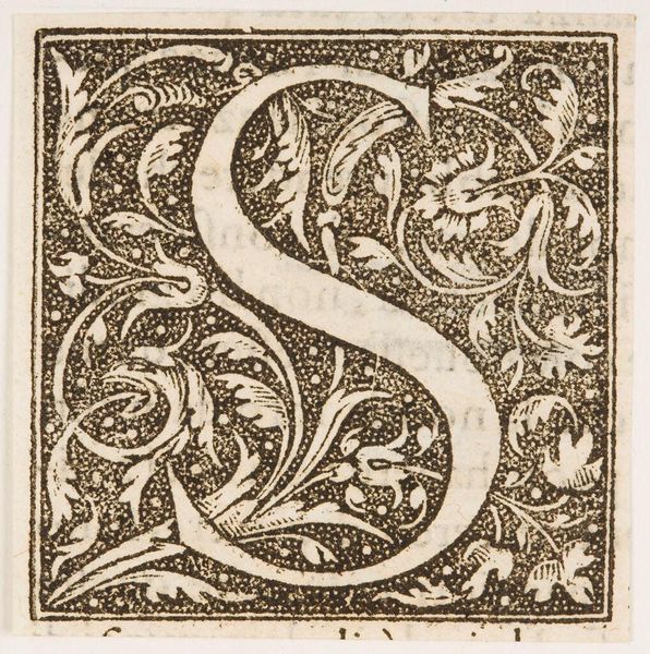 Editor: Here we have Capital P, an undated artwork by an anonymous artist. It looks like a woodcut print. The contrast between the black background and the white letter is striking! What do you make of it? Curator: Observe how the anonymous artist explores positive and negative space. The letterform itself is interwoven with organic, floral motifs. Note how the density of the stippled background accentuates the clean lines of the "P." Editor: The floral elements seem to crawl all over, as if the letter is blooming. Curator: Precisely. Do you see how the artist balances the geometry of the letter with the irregularity of nature, creating a dynamic tension within the composition? Editor: I see it now. It's not just a letter; it's a carefully constructed system of contrasting forms. Curator: Indeed. This close reading reveals the artist's sophisticated understanding of visual language. Editor: Thanks! I learned a lot about interpreting abstract forms.