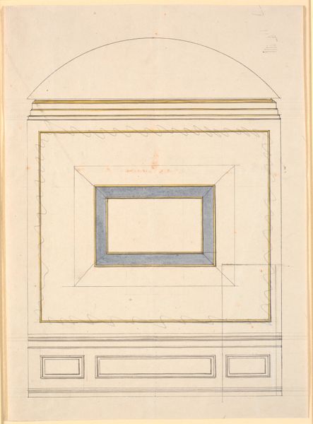Curator: The work before us, "Design for a Chimneypiece" attributed to John Yenn and dating from around 1770 to 1821, provides an intriguing example of Neoclassical architectural drawing. It’s executed in pencil, print and ink on paper, and now resides at the Metropolitan Museum of Art. Editor: It’s stark, isn't it? Utilitarian, but also monumental in a strange way. The flat expanses of the inner void give it a really modern feel. Curator: Exactly! Look closely at the geometric forms that govern the overall structure and details. This reflects the Enlightenment’s focus on reason and order, seen also in its revival of classical Greek and Roman motifs. Notice the frieze—a rhythmic arrangement of rosettes contained in squares. Editor: Those rosettes do stand out. They almost feel like a conscious attempt to soften the severe geometry with echoes of nature. Flowers, though stylized. The hearth as a central point—the emotional heart of the home represented here, maybe even warmth and safety, but in a controlled, very defined way. Curator: Certainly, and this controlled aesthetic speaks volumes about the social and political context of the late 18th century. It signals a move toward perceived order and stability at a time when the aristocratic order was very much under threat. Consider how the precise rendering signifies power, taste, and even a statement about the dominance of the intellectual over the emotional. Editor: So, the coldness isn't a bug, it's a feature? A calculated decision, rather than simply aesthetic? And I suppose the monumentality hints at the idea of legacy, an attempt to root that sense of dominance in time, embedding these symbols into the foundations of daily life. Curator: Precisely. This isn't simply a drawing of a fireplace; it’s a manifestation of an ideological stance expressed in geometric symbolism. Editor: Looking at it again, I see it less as a design for a fireplace and more as a portrait of a period's ambitions. Thanks, I wouldn’t have come to that interpretation without this conversation. Curator: Indeed, it shows how architecture and design can reflect underlying narratives of authority, class, and the shifting sands of societal structure. It certainly makes me question what ideological stances we embed in the architecture of today!