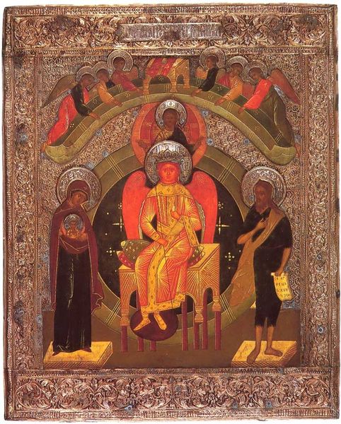 Editor: So, this is "Holy Wisdom," an oil painting on panel from 1618. It definitely has that distinctive icon style. What jumps out at me is the centrality of that red figure… What am I looking at here? Curator: The "Holy Wisdom," Sophia, is at the heart of it. Consider her redness, almost like fire. What emotions does that evoke? Editor: Hmm, power and maybe passion? Is she representative of some concept of the divine feminine? Curator: In a way, yes. Sophia is divine wisdom, a concept explored in the Old Testament and later integrated into Orthodox theology. Note the figures surrounding her - can you discern any references they might relate to? Editor: I see the Virgin Mary with Christ and possibly John the Baptist. It feels like she's at once both the bride of Christ, signified through these connections, but also like divine reason sitting on a throne above everyone? Curator: Exactly! She is an archetype with multifaceted significance. Her image synthesizes ideas: divine knowledge, spiritual insight, and ultimate understanding. Notice, the figures below her seem to spring forth, gestating her from what we know... What message does this choice convey? Editor: It feels as though it's trying to explain the origins and all-encompassing nature of divine knowledge. A bold synthesis! It gives me much to contemplate regarding feminine depictions in the divine sense... Curator: Precisely. It’s a memory encapsulated, of ancient debates about theology, and of our human aspiration for understanding, framed with cultural symbols.