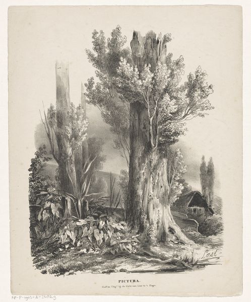 Curator: Welcome. Today, we are looking at Louis-Julien Jacottet’s "Bomengroep in een bos," or "Group of Trees in a Forest," created around 1836 to 1838. The piece, residing here at the Rijksmuseum, is an engraving on paper. Editor: It has a rather somber feel. The gray scale is dense. The lines in the engraving almost vibrate, lending the entire composition an anxious energy, like static electricity before a storm. Curator: That tension, I think, emerges from the artist's engagement with Romanticism—particularly its fascination with the power of nature and the emotional impact of landscape. You see that in how Jacottet uses chiaroscuro, creating dynamic light and shadow. Consider how the means of print production, particularly engraving, aided this: repeatable, reproducible for mass consumption of imagery... Editor: Yes, the contrasts certainly define the structure. Look at the central tree; the way Jacottet articulates the knotted roots with incredible detail juxtaposes with the hazy background. The use of line is stunning; its fineness captures the bark's texture and root system with real precision, then dissolves into almost nothing in the mist. Curator: And think about what engraving meant at the time. This was not just about art, but about disseminating knowledge, creating a visual inventory of the natural world. An important industry. Did Jacottet himself print and distribute this? Where was his workshop, and what did he and his fellow artisans produce aside from artworks? Editor: An important point to keep in mind, and it resonates within the stylistic elements we see—a beautiful balance of realism and Romantic ideals. But, beyond the social contexts and the economic realities of its creation, this print succeeds because of its powerful visual vocabulary: stark contrasts, almost photorealistic details in the foreground, the eerie diffusion of the forest background... Curator: The intersection, though, of all of this—the material conditions of Jacottet's labor, alongside the artistic choices – helps us really understand not just the "what" but the "how" and "why" of the piece, revealing this cultural moment... Editor: Certainly. It’s precisely how these factors come together—Jacottet’s artistry mediated through material realities—that makes this work still able to grab us nearly two centuries later. A complex picture made via relatively simple material means.