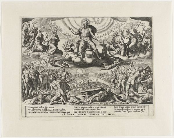 Jean Louis Roullet made this print, "Jupiter laat het schild van Theseus smeden door de cyclopen", sometime in the late 17th century. You see the Cyclops hard at work, hammering away at Theseus's shield. The clang of the hammer and the heat of the forge are almost palpable. Roullet's masterful use of line brings forth not only the muscularity of the Cyclops but also the rich textures of metal. Note the contrast between the brute force of the forging and the refinement of the finished shield. The image is a testament to the skilled labor required to produce such a magnificent object. It’s a reminder that even mythical heroes rely on the expertise and craftsmanship of others. It challenges us to look beyond the heroic narrative and appreciate the artistry and labor that underpin it. By focusing on these making processes, Roullet invites us to consider the broader cultural and social context in which the artwork was produced. This approach allows us to understand the full meaning of an artwork.