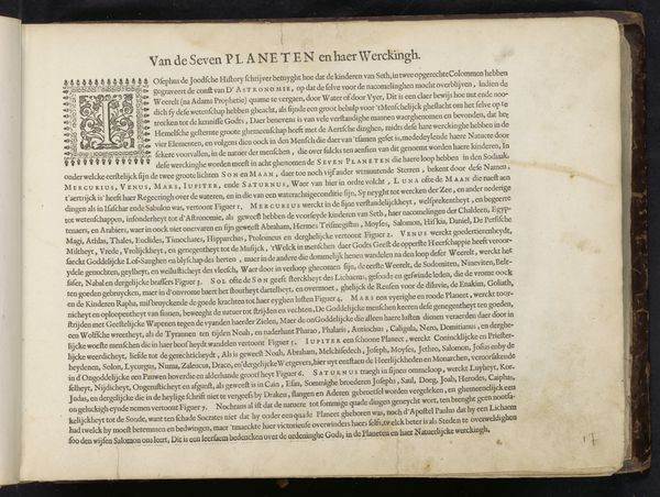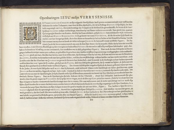 This is a page from Jan Philipsz Schabaelje’s book *Gheschiedenissen Israels in de Woestyne*, printed in the Netherlands in the 17th century. The dominant symbol here is the letter ‘A’, ornately decorated with foliage and figures, marking the beginning of a chapter recounting the Israelites' journey through the desert. The initial 'A' evokes the classical tradition of illuminated manuscripts, a practice dating back to the early Middle Ages. This symbol of new beginnings also appears in various religious and secular contexts throughout history. Consider the Tree of Jesse motif, where a genealogical tree springs from the letter ‘J’ to trace Christ's lineage. Or the serpent, a symbol of chaos, and healing, depending on the culture it appears in. Here, the ornate ‘A’ symbolizes not just a beginning, but the start of a transformative journey. The image and the stories it introduces engage viewers on a subconscious level, tapping into the collective memory of humanity’s quest for meaning and redemption. It's a cycle of cultural memory, reappearing, evolving, and accruing new layers of significance across the ages.