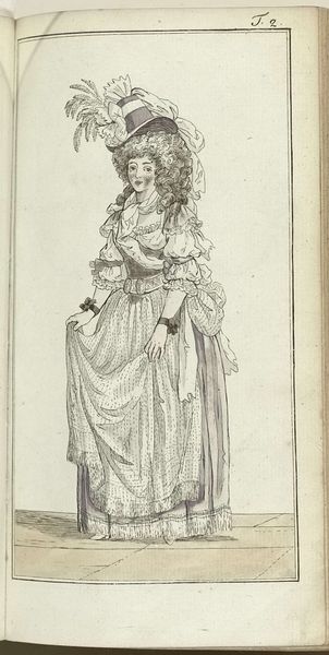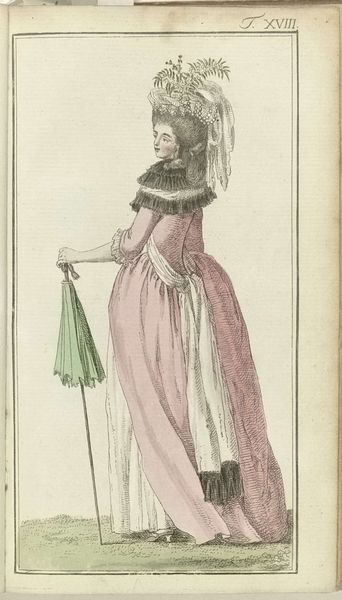 Editor: This is "Journal des Dames et des Modes, Costume Parisien, 1805, An 13 (642) Bonnet de Dentelle…" from 1805. It seems to be a watercolor print of a woman's fashion. The tones are very soft, almost faded. What catches your eye in this piece? Curator: Beyond the delicate rendering, I'm drawn to the context of its creation. This wasn't just about pretty dresses. These fashion plates reflected a newly-stabilized, post-revolutionary French society. How might we see this emphasis on elegance as a deliberate reconstruction of social order after a period of upheaval? Editor: That’s a really interesting way to look at it. I was just thinking about the aesthetics. So, you see it as a political statement almost? Curator: In a way, yes. Consider the neoclassical style, echoing ancient Greece and Rome. What did those societies represent to the French at this moment? Also, who was this imagery *for*? Were these images accessible to everyone, or were they targeted at a specific social class? Editor: I suppose mainly the upper class… a way to set themselves apart through fashion and access to these publications. Curator: Exactly. And by adhering to these styles, what kind of performance was each women engaging in and to what end? We have to consider not just the individual woman, but the power structures at play. Does seeing it in this context shift your perception of the "faded tones," perhaps seeing them as less delicate and more pointed? Editor: It does, actually. I am suddenly much more aware of how the image is less about art, but about how fashion can convey political and social status in post-revolution France. Curator: And that fashion could then reflect a conscious effort of rebuilding of a nation. Editor: This really gives me a fresh perspective on how something as simple as a fashion plate can speak volumes about a specific time and place.