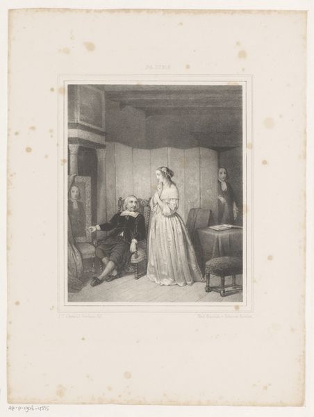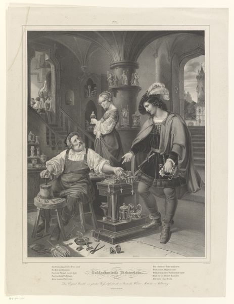 Ernst Friedrich Oldermann made this print of a man viewing merchandise at a goldsmith’s, although the exact date is unknown. The image captures a moment of commerce and display, reflecting the economic and social values of the time. Made in Germany, the print is a window into the 19th-century world, particularly the rise of the middle class and their engagement with luxury goods. We can see the elaborate dress of the customer, the detailed interior of the shop, and the careful arrangement of the merchandise which all point to a culture that valued craftsmanship, trade, and the visual representation of wealth. Perhaps Oldermann is commenting on the emerging culture of consumerism and the social dynamics between merchants and their clientele. To gain a deeper understanding, we might explore 19th-century German trade practices, sumptuary laws, or the role of artisans in the burgeoning industrial economy. Art is always embedded in its historical context and the job of the art historian is to unpack those layers of meaning.