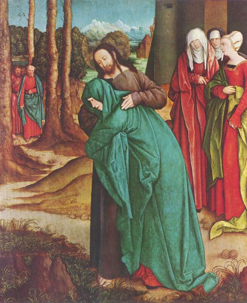 Curator: This is Dante Gabriel Rossetti's oil painting "The Meeting of Dante and Beatrice in Paradise," created in 1854. It’s currently held in the Fitzwilliam Museum, part of the University of Cambridge. Editor: It's striking how muted the colors are, considering the subject. Almost a somber tone despite its representation of paradise. The pre-Raphaelite dedication to detail is certainly present. Curator: Indeed. Notice how Rossetti employs line and color to create distinct planes within the composition, directing our gaze. Dante is isolated in darkness, while Beatrice and her attendants radiate ethereal colors of serenity and harmony. The visual construction clearly demarcates the earthly versus the heavenly realms. Editor: I'm drawn to the textiles represented, particularly Beatrice's drapery, her garments. Look closely and you realize Rossetti carefully delineated the textures – a subtle emphasis on the tangible earthly materiality of each. It begs the question: What fabrics would constitute garments fit for paradise, or even proximity to the divine? Are these costly imported wools? Perhaps Rossetti even worked from models garbed in fabric woven and dyed using craft guilds’ methods. Curator: Interesting point! Although the precise materiality might be opaque, Beatrice's upward glance and delicate hand gesture contribute to a profound symbolism of the transcendent female figure. The figures holding musical instruments, lyres in this case, function structurally as framing elements, highlighting Beatrice and underscoring the harmonic unity within Paradise. Editor: Beyond this composition, think of Rossetti's process: grinding pigments, layering paint... his labour shaped our view of 'Paradise'. What were the conditions like in his studio? Did these Pre-Raphaelite artists see themselves as more than 'artists' and perhaps even ‘artisans’? Curator: The artist was surely channeling complex religious allegories through a pictorial idiom accessible to a Victorian audience. He provides us, via this composition, with visual vocabulary of devotion, faith and spiritual redemption. Editor: Right. And viewed materially, this "paradise" came at the cost of Rossetti’s labor, material sourcing, and the cultural capital needed to depict such a subject with such detail. I will definitely research if Rossetti worked from models who used artisanal methods. Curator: Precisely. By understanding how the piece orchestrates light, form, and symbolism, we unlock the intellectual core of Rossetti’s Pre-Raphaelite vision. Editor: Indeed, looking at what labor brought "paradise" to the canvas gives new insight.