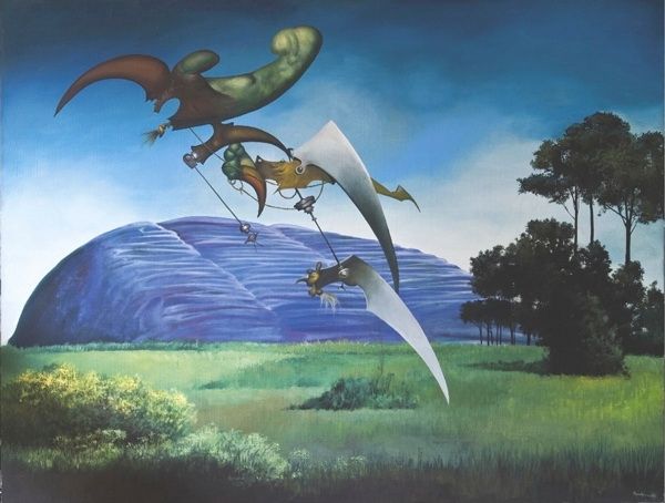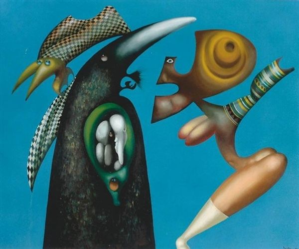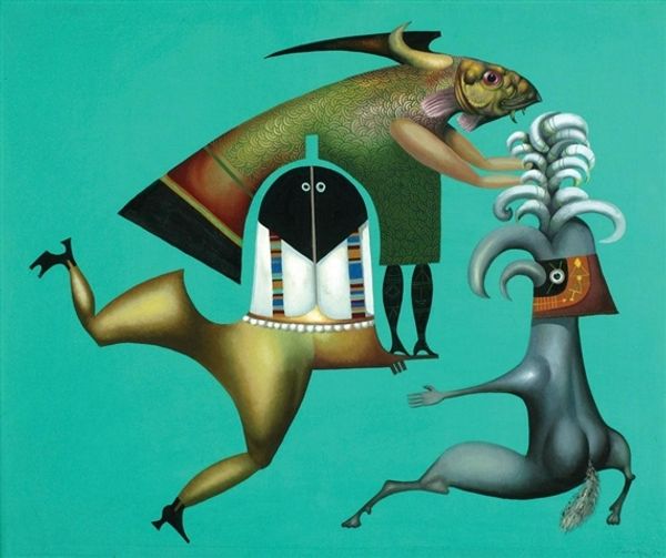 Here we see an ‘Untitled’ painting by Jules Perahim, made with oil on canvas. A procession of figures populates the composition, set against a soft, green background. The figures are rendered in a mix of angular and curvilinear forms with earthy tones punctuated by vibrant splashes of red, blue and green. Perahim uses a pictorial language that seems to hover between figuration and abstraction, creating a semiotic tension. The artist uses symbolism to subvert traditional notions of representation. The geometric and biomorphic shapes disrupt any clear narrative, inviting us to question the conventional ways we perceive form and meaning. Note the interplay between organic shapes and hard edges. This juxtaposition challenges fixed meanings, suggesting a world where boundaries are fluid and categories are constantly redefined. Perahim invites us to reconsider the structures that shape our understanding of art and reality.