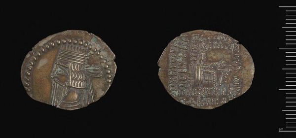 Editor: So, this is a Drachm of Gotarzes II. It’s… well, it's a coin. One side shows a regal portrait, the other, some sort of inscription. What do you see in this piece? Curator: A pocket-sized power statement, really. Imagine holding the weight of a kingdom in your palm. The detail in Gotarzes’ portrait, the way they've captured his authority, it's like a tiny mirror reflecting an empire's ambition. Does it make you wonder about the stories it could tell? Editor: Absolutely! It's like holding a piece of history. I guess it really makes you consider how carefully those images are crafted. Thanks! Curator: My pleasure! It's a tangible link to another time. Every mark, every symbol, whispers of lives lived and choices made.