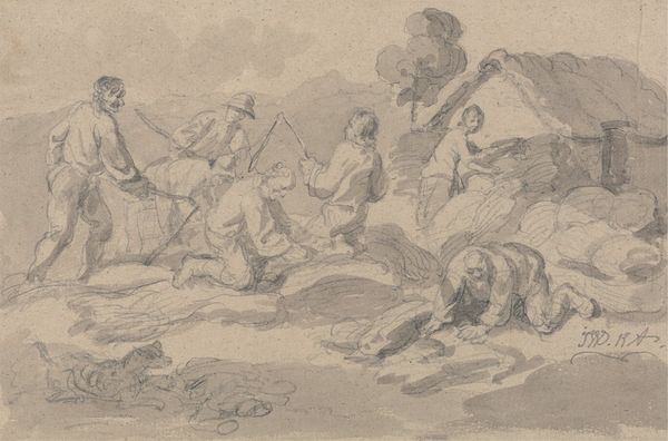 This stipple engraving, Fishermen, was made by Robert Blyth in the late 18th century. The composition, dominated by monochromatic shades, evokes a sense of neoclassical calm despite the scene's labor. Blyth uses line and form to create a detailed image of fishermen hauling in their catch. Consider the poses: the curve of their backs, the sinews of their arms, the weight of their bodies, and the details within the net, which draw our eyes to the center of the scene. A woman stands to the right, seemingly unaffected, suggesting themes of labor, class, and the aesthetic ideal. Blyth’s focus on form over overt expression subtly challenges the viewer. It moves beyond the narrative to engage with Enlightenment-era ideas about art, labor, and the social order. It prompts us to reflect on the artistic and philosophical dialogues inherent in its very structure.