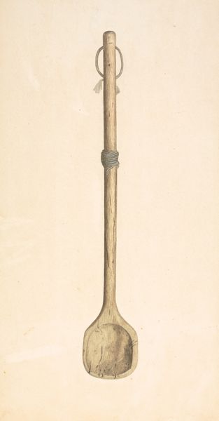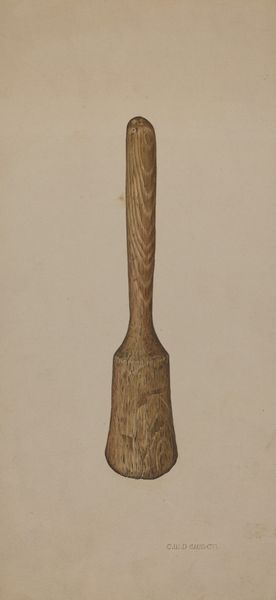 Curator: What an unexpected painting subject. William Frank gives us "Chopping Knife," from around 1942, rendered in watercolor and drawing. I’m struck by the sheer ordinariness of it, its simple form rendered with such focused attention. Editor: Utilitarian elegance, perhaps? Immediately, I’m drawn to the materiality here: the rough, honest grain of the wooden handle meeting the worn, greyed metal of the blade. It’s almost brutal in its straightforwardness. This isn't a precious object; it’s a tool. Curator: Precisely! And yet, Frank invites us to *see* it. He coaxes out its inner presence, makes us consider its weight, its balance, and, yes, its story. I mean, I wonder about the hands that have gripped that handle, the surfaces it’s hammered upon. What history is embedded in this mundane object? Editor: That patina, the visible wear, hints at the hands and labor involved, absolutely. Someone made this tool, likely worked it hard, and then Frank immortalized it in paint. We're seeing a convergence of making here, industrial process meeting artistic interpretation, highlighting class and everyday use. Curator: And even deeper than that, I think it also hints at home, and the sustenance that could be made thanks to this knife. Perhaps it reminds the artist of safety and stability during turbulent times. And look how lovingly rendered it is. You could almost reach out and touch the wood, feel the cold, gritty texture of the metal. Frank's almost giving soul to something soulless. Editor: It's also important to acknowledge the choices made in the presentation of the piece. A neutral background forces a concentration on this implement. What could the social or political background of 1942 brought into this perspective of ordinary subjects? What exactly did William Frank mean by portraying a chopping knife and turning it into a piece of fine art? It challenges traditional fine art expectations. Curator: It asks us, I think, to redefine our notions of beauty and value. To find the extraordinary in the ordinary, to see art not just in grand landscapes or portraits, but in the everyday tools that shape our lives. Perhaps the story can vary depending on everyone who finds the time to gaze at the illustration. Editor: In that way, Frank has opened the door to further examination and discussion of value within our society and its influence within art as well. Thanks for pointing all of that out!