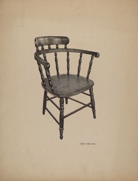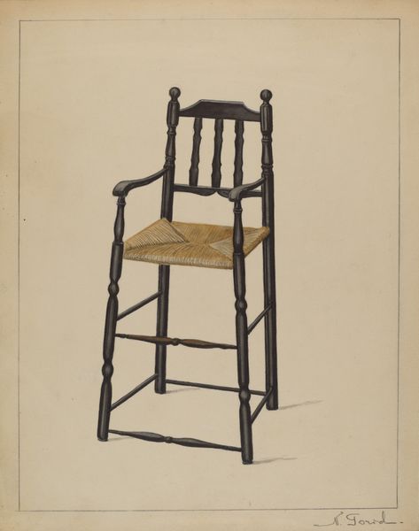 Editor: Here we have Harry Mann Waddell’s "Chair," created in 1937 using watercolor and drawing. I'm immediately struck by how the artist captured the texture of the woven seat so realistically. It seems like a very straightforward representation, but it also feels very... present. What do you see in this piece? Curator: The strength here lies in the interplay of forms. Notice how the rigid verticals and horizontals of the frame contrast with the textured, almost organic, pattern of the woven seat. The limited palette further emphasizes this structural dichotomy. Waddell prompts us to consider the essential geometry underpinning everyday objects. What might seem, at first glance, a mere representational exercise transcends into an engagement with the formal elements of design. How does that impact your understanding? Editor: I think it's interesting that you mention the "geometry" of something as commonplace as a chair. Does focusing on the structure somehow elevate it, even without bright colors or intricate detail? Curator: Precisely. By isolating the chair and meticulously rendering its form and the relationship between its parts, Waddell compels us to analyze its fundamental nature. It shifts our perception of something functional into a subject worthy of aesthetic contemplation. The chair, divorced from context, becomes a study in form itself. Editor: So, it's less about what the chair is used for, and more about what it *is*? I appreciate the idea of finding artistry in something so ordinary through form. Thanks! Curator: An excellent insight. The true subject of art may not be the object represented but, rather, the very act of perception and the aesthetic relationships uncovered within.