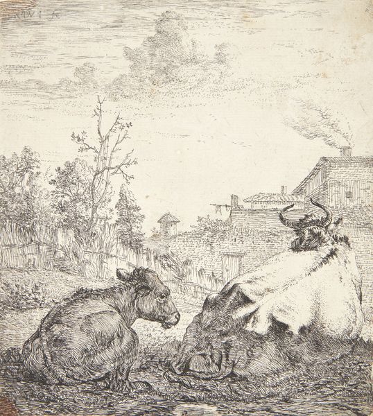 Curator: This etching, likely from the latter half of the 17th century, is titled “Hyrdinde, der spinder uld,” which translates to “Shepherdess Spinning Wool.” Editor: The density of line work gives it an almost overwhelming sense of texture, and there's a peaceful aura to it. I’m immediately drawn to the woman and her relationship to these grazing animals and to the overall agricultural activity pictured. Curator: I find myself wondering about the historical role of women in rural economies and the division of labor. This woman is spinning wool, seemingly managing both the labor and the animals, hinting at perhaps undervalued contributions within Dutch Golden Age society. Editor: Right, and if we really consider the process here, think about how deeply ingrained wool production was – from raising sheep, shearing, cleaning, spinning—laborious processes! It also touches upon gendered labor of that period: who performs which tasks and how they were, and perhaps still are, valued, or not. Curator: The composition also creates an interesting interplay between the figures; note the figure of the child lurking over the fence. Its presence may serve as a commentary on social norms and stages of life. It also speaks to the cultural obsession that often reduces people to rural stereotypes in Golden Age artwork, right? Editor: Absolutely. The way the wool connects from raw material to the finished thread exemplifies the whole transformation chain and it reminds me that something seemingly "simple" actually represents very intricate industrial and commercial networks, and it’s also linked to colonization and global trade routes of that time. Curator: Thinking about the historical underpinnings really deepens one’s reading of the piece. It reminds us how genre paintings like these, seemingly quaint, actually tap into larger sociopolitical landscapes, revealing hierarchies related to gender, class, and access to resources. Editor: Precisely! When viewing, it can open pathways to consider historical consumption, craftsmanship, and social context, making us appreciate the depth of each element and artistic processes beyond surface representation. It invites the observer to rethink "genre scenes" by recognizing hidden systems of class relations behind it.