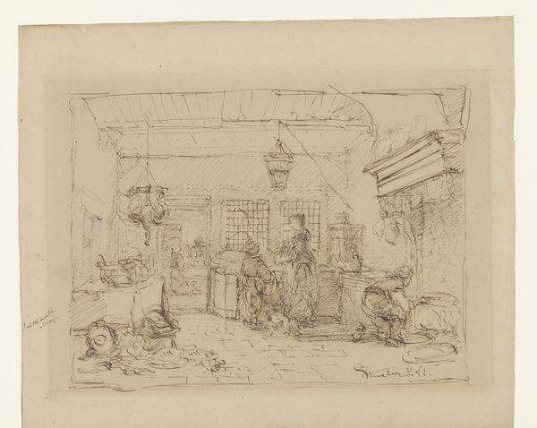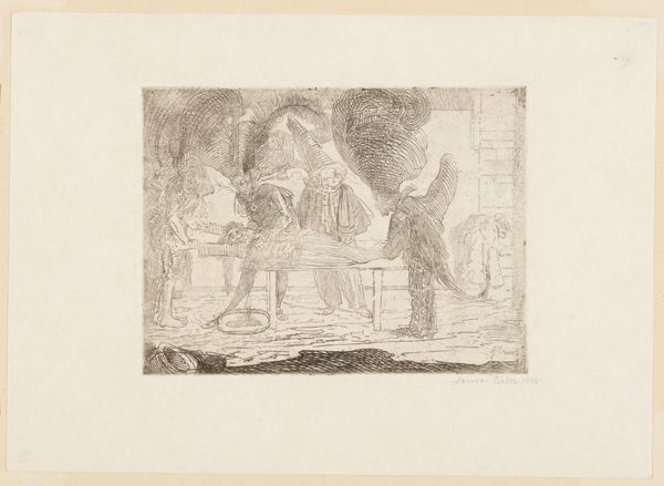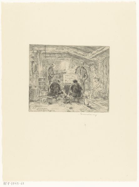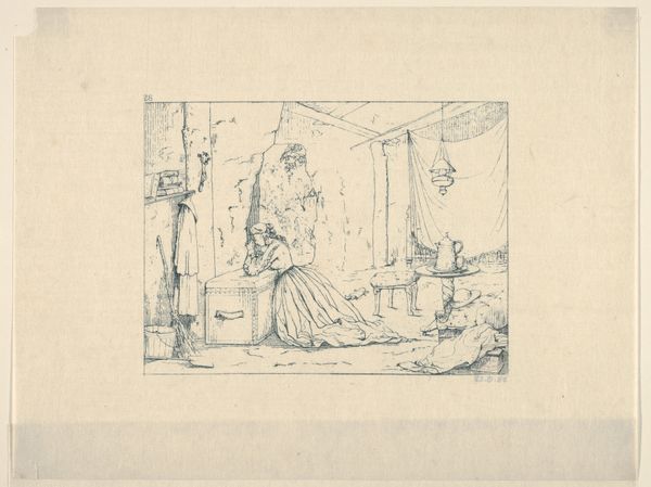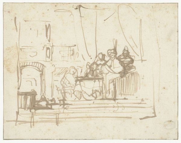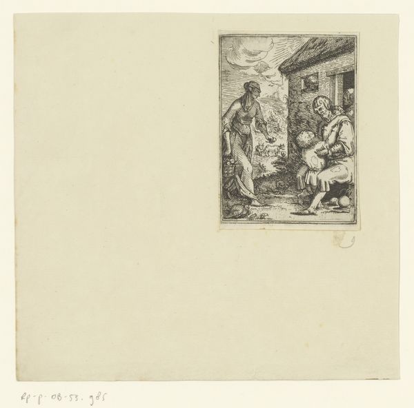 Curator: This is "Departure of Tobias and the Angel," an etching by Adam von Bartsch, from 1782. It has a lovely, intimate quality, doesn't it? Editor: Yes, it does! I love the sketchy feel and how domestic the scene is. The angel and Tobias almost seem like ordinary travelers. What strikes you most about this piece? Curator: What interests me is how it challenges the conventional portrayal of religious narratives. Look at the positioning of the women, the one at the spinning wheel and the other simply sitting. How does this portrayal of women engage with 18th-century social structures, their roles and societal expectations, within the sphere of religious art? Editor: I see what you mean. They’re not idealized figures. Their presence almost grounds the scene. Are you saying Bartsch might be making a statement about the everyday lives of women? Curator: Exactly! And consider the political climate of the late 18th century – a time of revolution and questioning of authority. Doesn't this simpler representation, far from the grandiose religious works commissioned by the church, suggest a democratization of faith, accessible to all? Editor: That's a completely different angle than I initially considered. I was just drawn in by the lightness of the lines, but you're showing me there's so much more beneath the surface. Curator: Indeed. By situating the figures in this everyday setting, it challenges the traditionally distant and hierarchical presentation of religious subjects. It allows us to think about faith as interwoven with daily existence. The seemingly simple etching then opens up a complex discussion about power, gender, and religion. Editor: I really appreciate you pointing that out; it gives me a new way to approach historical art. It is definitely not *just* a biblical story!